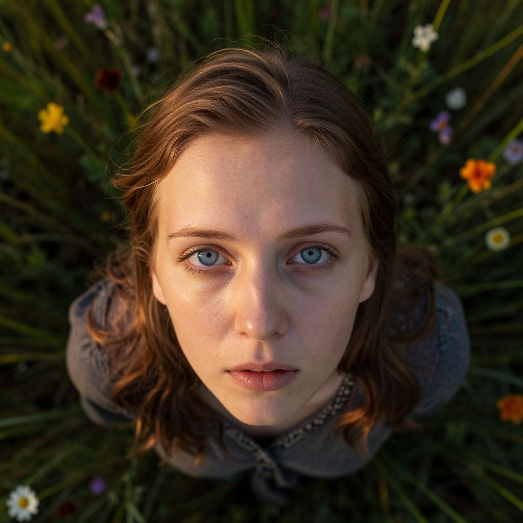 Photograph of a young Caucasian woman with fair skin, blue eyes, and brown wavy hair, looking directly at the camera from a top-down perspective. She is wearing a grey hoodie and is surrounded by a dark green, grassy field with small, colorful flowers including yellow, white, and orange daisies. The lighting highlights her face, creating a slight shadow on the right side. Her expression is neutral, with slightly parted lips. The background is blurred, focusing attention on her face. The image has a slightly surreal, almost hyper-realistic quality with vivid colors and sharp details.