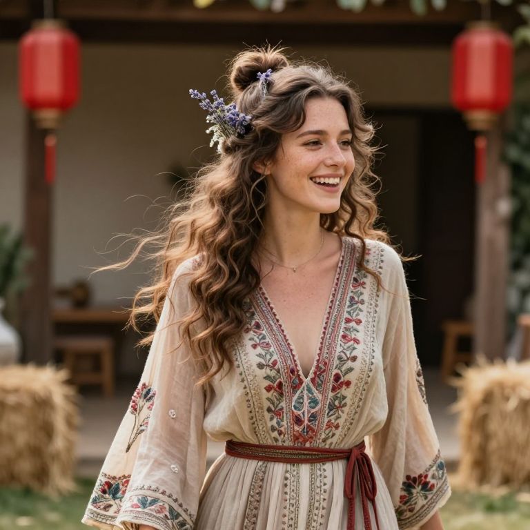 A boho style bridal maid with a flowing, untamed hairdo composed of hand-tied bun and side curls, adorned with dried lavender and wildflowers, dressed in a flowing, earthy-toned, embroidered dress with a bohemian belt, standing in a rustic outdoor wedding venue with red lanterns and hay bales, her face glowing with genuine enthusiasm and soft freckles.