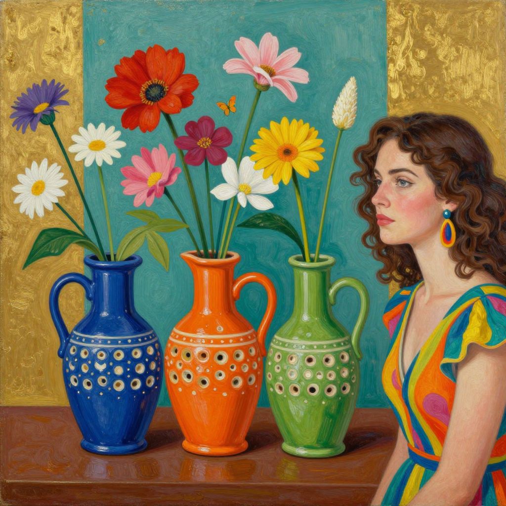 Vibrant still life painting featuring three ceramic jugs—blue, orange, and green—with perforated designs, each holding distinct floral arrangements, set against a contrasting background of teal and gold, alongside a woman with curly brown hair, adorned in a colorful dress and earrings, gazing contemplatively to the side.