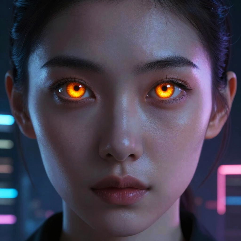 Futuristic demon eyeliner on a cyberpunk character, neon black and red makeup with sharp winged tips, glowing eyes, technological and dark cityscape background, vivid contrast and dramatic lighting, detailed avant-garde fantasy character portrait