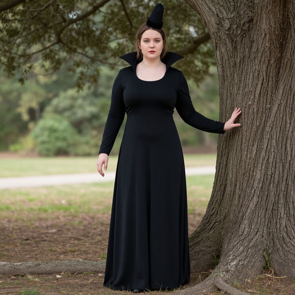 Evil queen plus size costume, 1girl, solo, dress, outdoors, tree, black dress, standing, long sleeves, long dress, hat, full body