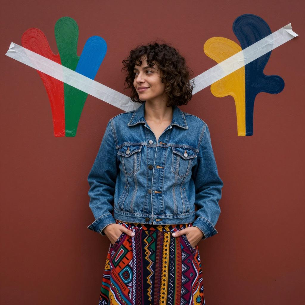 A woman with short, curly dark hair stands against a red wall. She wears a denim jacket and holds a colorful, patterned skirt. Two colorful, abstract, paint-like shapes are on the wall behind her, with white tape crossing over them. She stands with a slight smile and hands in her pockets. The image has a slightly dark, moody lighting.