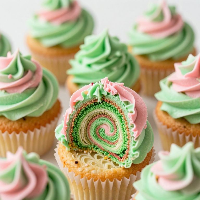 Imaginative Christmas swirl cupcakes burst with a magical blend of green and pink frosting, revealing a mesmerizing, spiraling interior that defies the ordinary, as if crafted by whimsical fairies.