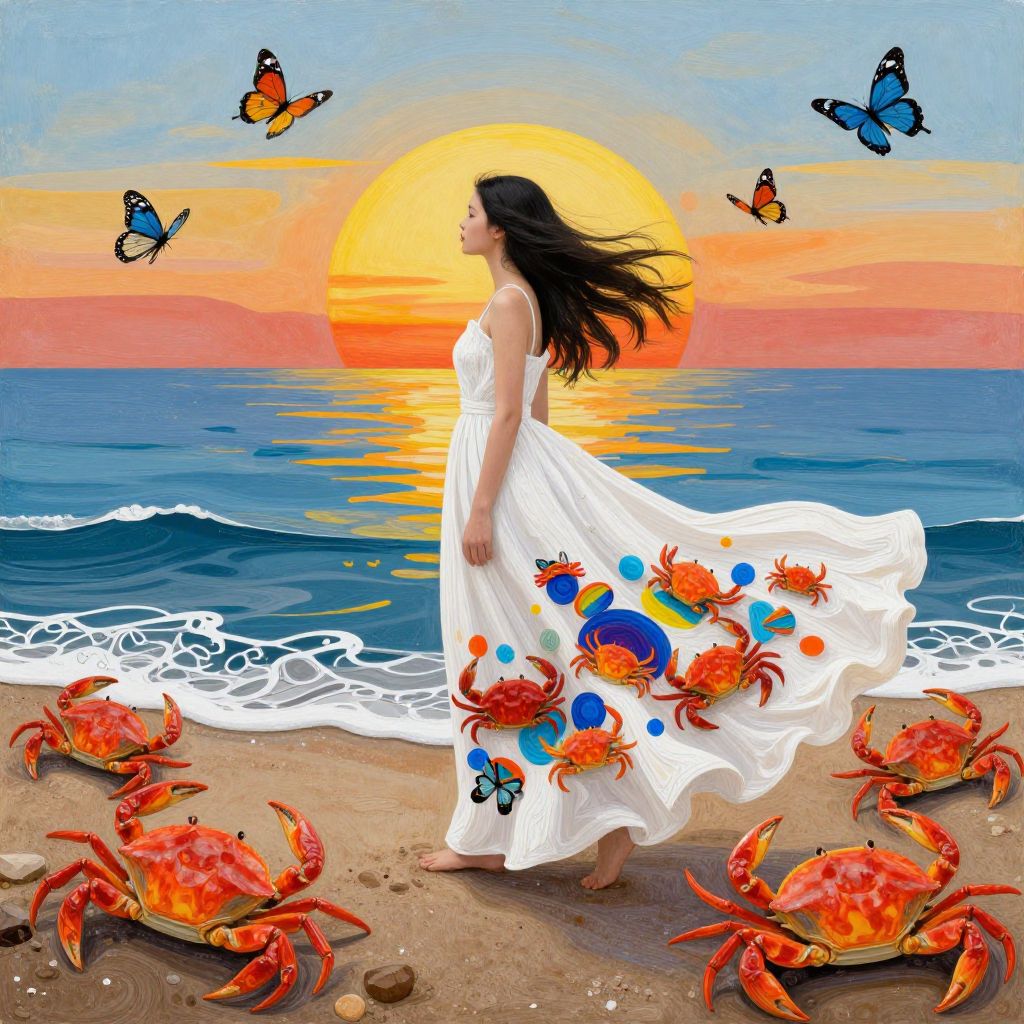 Digital painting of a woman in a white, flower-patterned dress, with long black hair, standing on a beach at sunset, surrounded by crabs