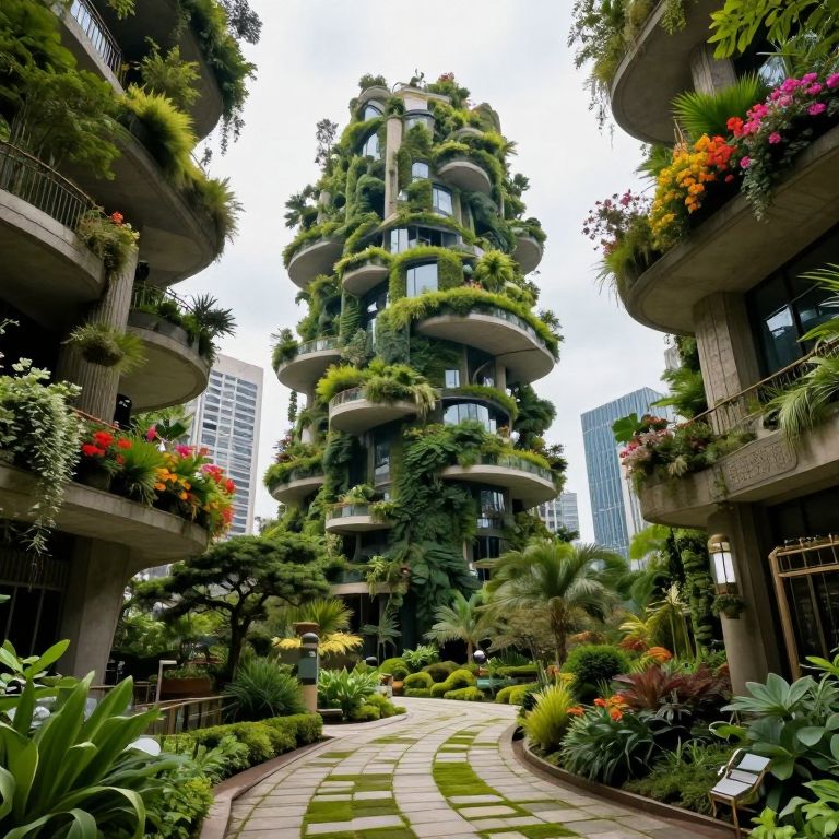 Organic architecture flourishes in this futuristic cityscape, where towering structures cascade with lush greenery, spiraling balconies adorned with vibrant flowers, and stone pathways interspersed with mossy tiles, creating a seamless blend of nature and urban design.