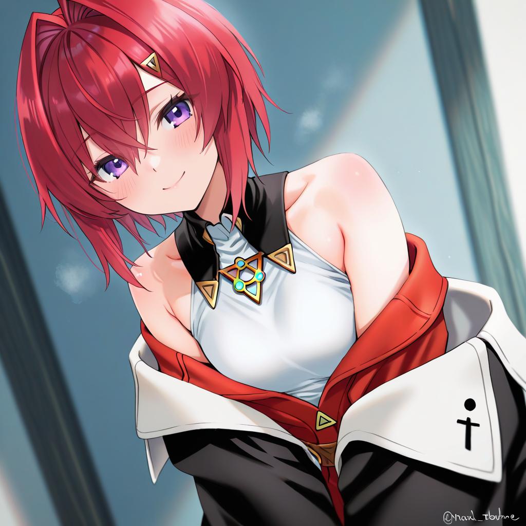Ange katrina (1st costume), nijisanji, 1girl, blue eyes, hair between eyes, red hair, short hair, hair intakes, hairclip, long sleeves, off shoulder, virtual youtuber, virtual youtuber, by artist camonome, animagine