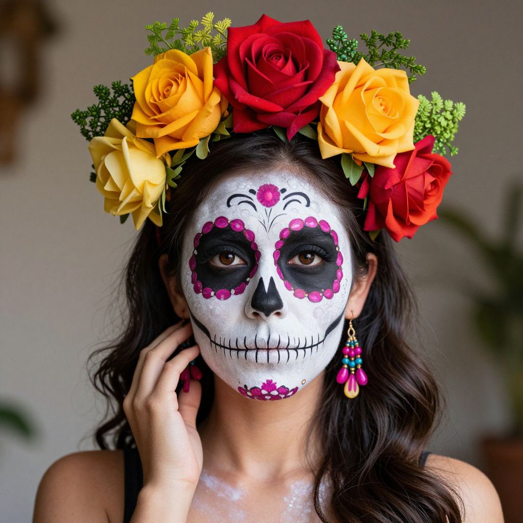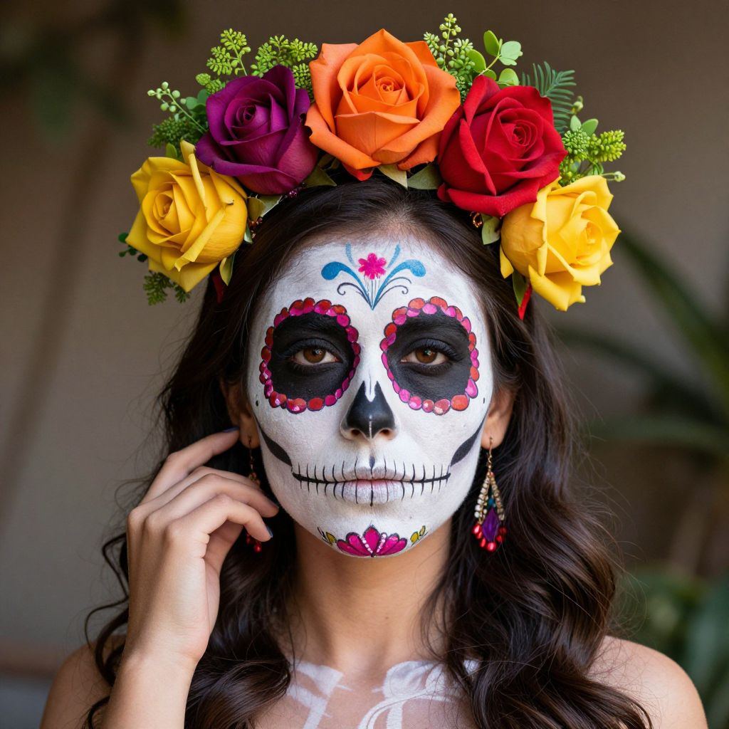 Woman showcasing vibrant sugar skull makeup with intricate floral crown featuring six colorful roses and greenery, embodying the festive spirit of Day of the Dead.