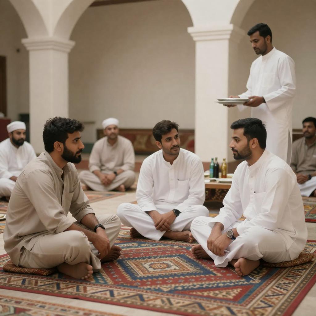 Photograph of a traditional Indian cultural event. Musicians in white and beige traditional clothing play drums and cymbals in the foreground. A raised platform with a seated figure holding an ornate umbrella is centered. A large crowd watches from a stone wall in the background. Mountains and palm trees are visible in the distance. Bright sunlight casts strong shadows.