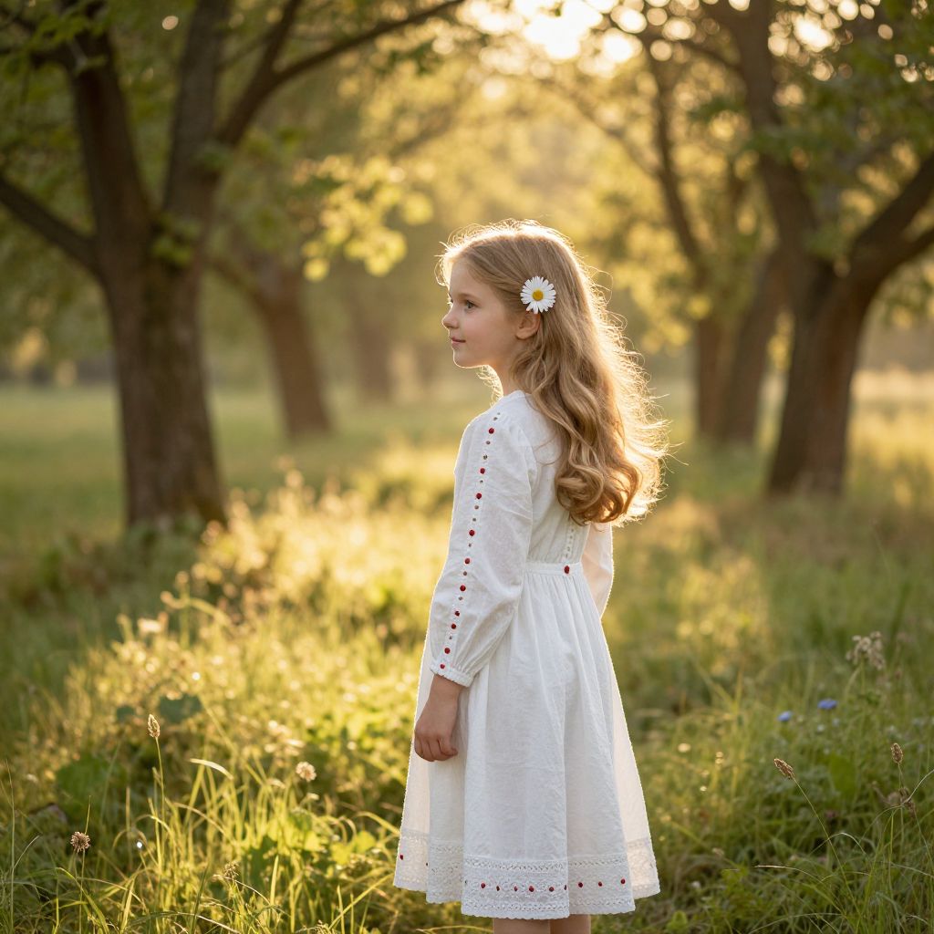 Photograph of a young girl with long, wavy blonde hair, wearing a white, long-sleeved, embroidered dress with a white daisy hairpin on the left side. She stands in a sunlit, grassy meadow with tall trees in the background, their trunks creating a natural, blurred pattern. The sunlight filters through the leaves, casting a warm, golden glow. The girl is positioned in profile, looking to the left, with soft, natural light highlighting her hair and dress. The grass is lush, with small wildflowers scattered throughout. The overall mood is serene and peaceful.