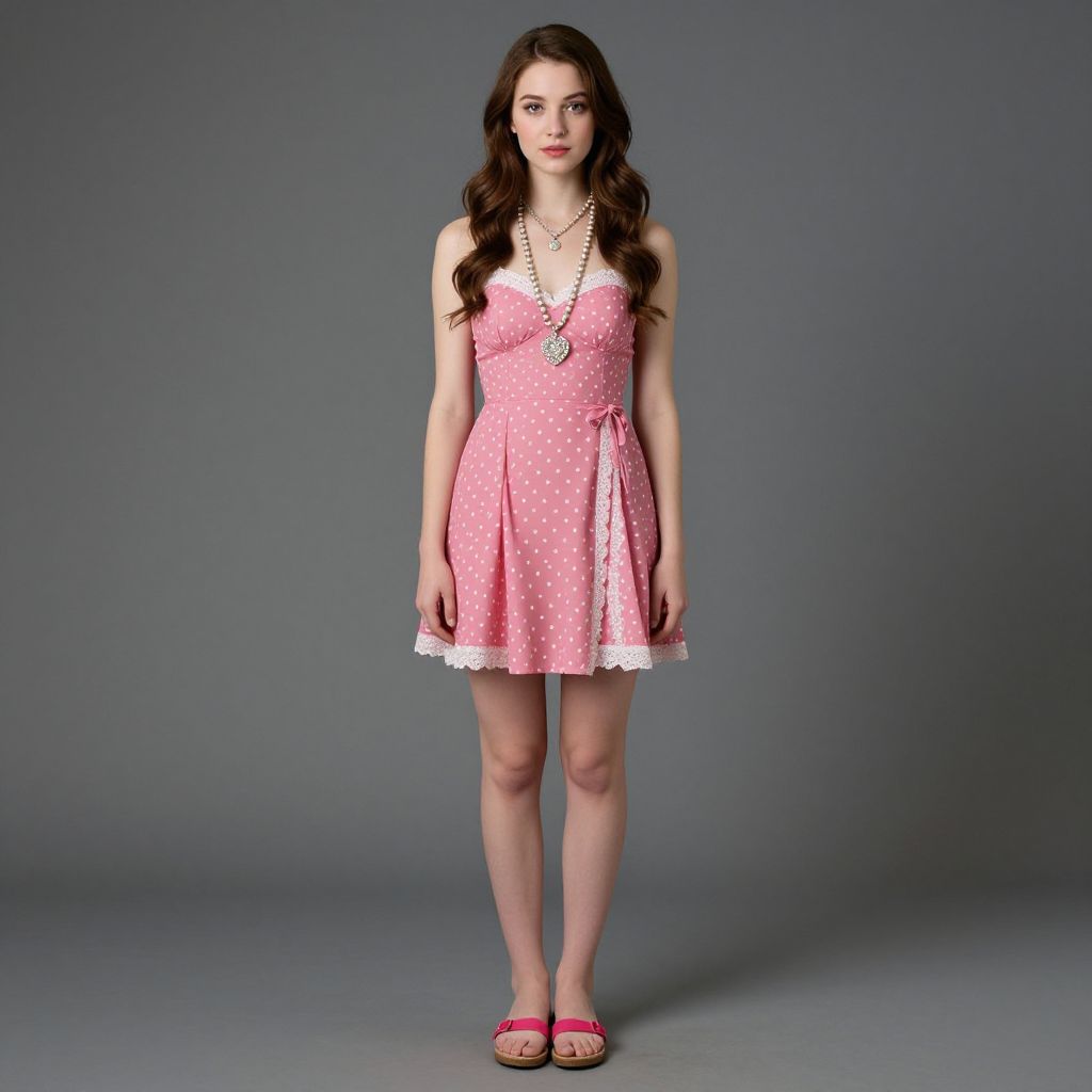 Photograph of a young woman standing against a plain gray background. She has long, wavy brown hair and fair skin. She is wearing a pink, sleeveless, knee-length dress with white polka dots, a white lace trim, and a cinched waist with a bow. Around her neck is a long black beaded necklace with a pendant. She is also wearing pink flat sandals. Her expression is neutral, and she is looking directly at the camera. The lighting is even, highlighting her outfit and the texture of the dress fabric.