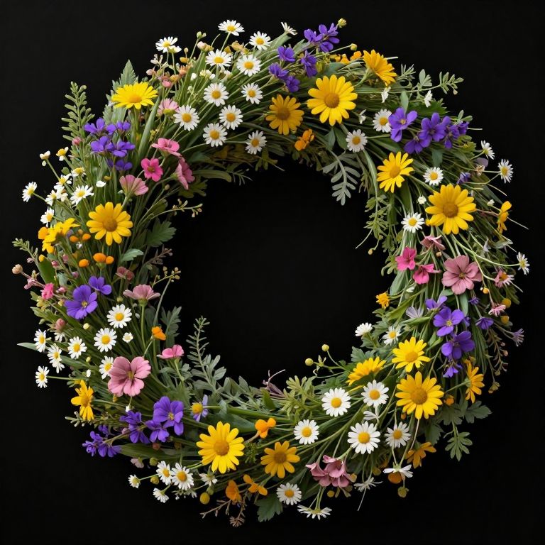 The image presents a swirling wreath of large wildflowers arranged in a circular formation against a dark background, creating a striking contrast. The wreath is densely populated with a variety of flowers, including vibrant yellow daisies, delicate white daisies, and striking purple and pink blooms. The flowers are interspersed with green leaves and delicate branches, adding texture and depth to the composition. The overall arrangement is symmetrical, with the flowers and foliage evenly distributed around the center, giving the wreath a balanced and harmonious appearance. The dark background enhances the vivid colors of the flowers, making them stand out prominently. The image is highly detailed, with realistic textures and lighting, and has a cinematic quality, capturing the natural beauty of the wildflowers in a visually captivating manner.