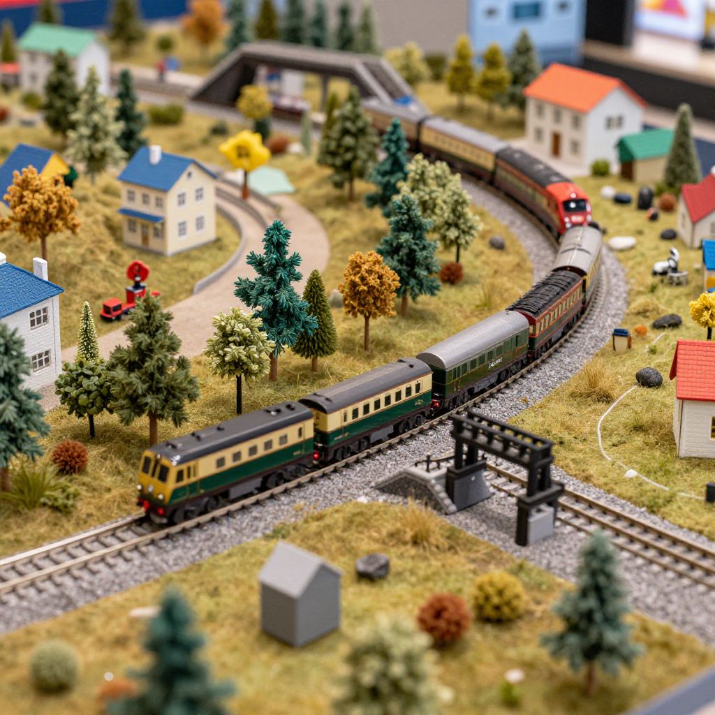 Photograph of a detailed, colorful model train curving through a miniature suburban landscape with trees, houses, and a red locomotive.