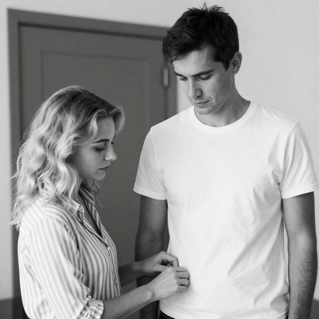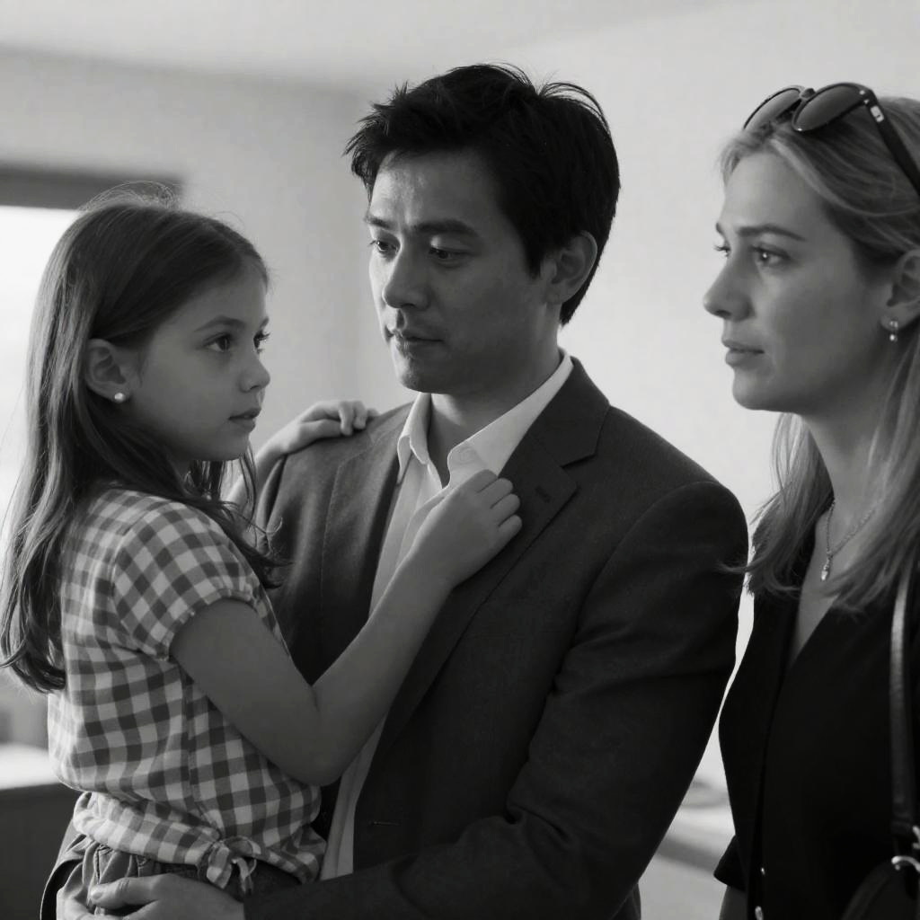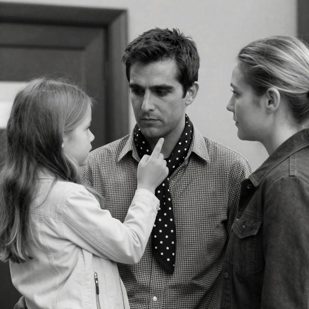 Black-and-white photograph of three people. Central man with dark hair, wearing checkered shirt and polka dot scarf, looks serious. Young girl with long blonde hair, wearing light jacket, touches his face. Woman with light blonde hair, wearing dark jacket, looks to the side. Indoor setting, blurred background.