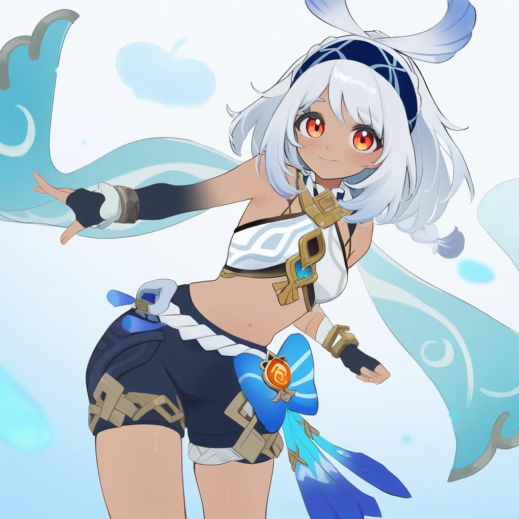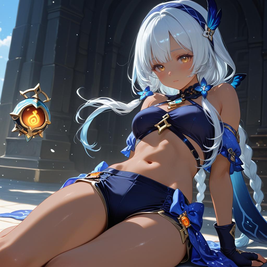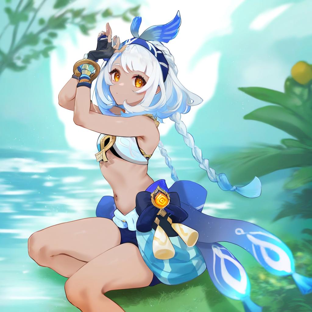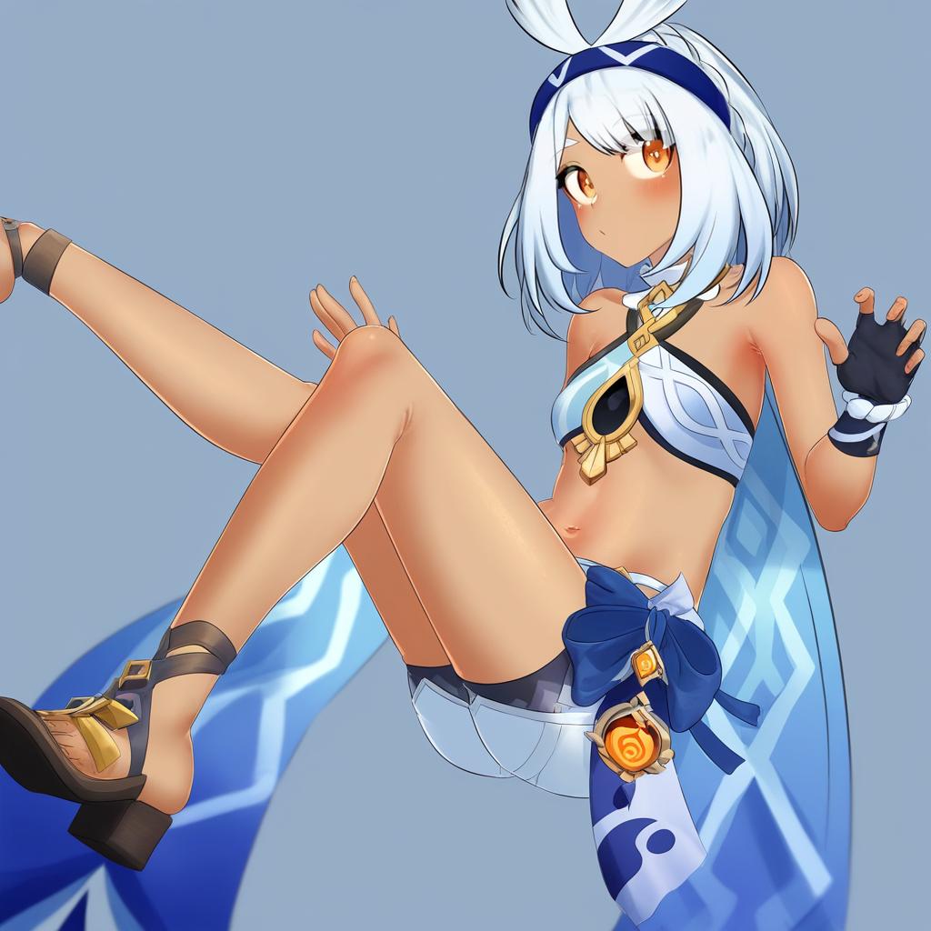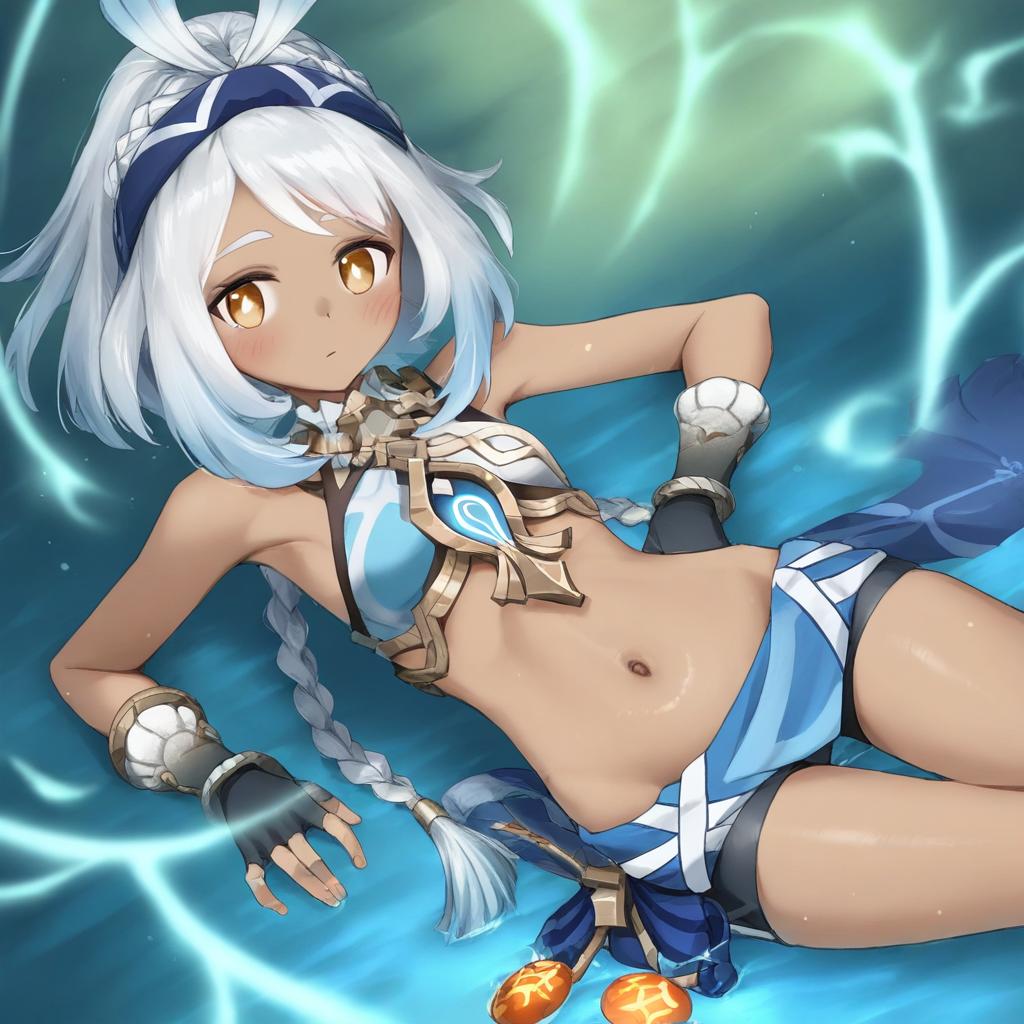 Mualani (genshin impact), genshin impact, 1girl, dark skin, red eyes, orange eyes, long hair, white hair, grey hair, light blue hair, blue hairband, low twin braids, braid, small breasts, thighs, navel, fingerless gloves, bare shoulders, midriff, stomach, by artist muffin (sirumeria), animagine