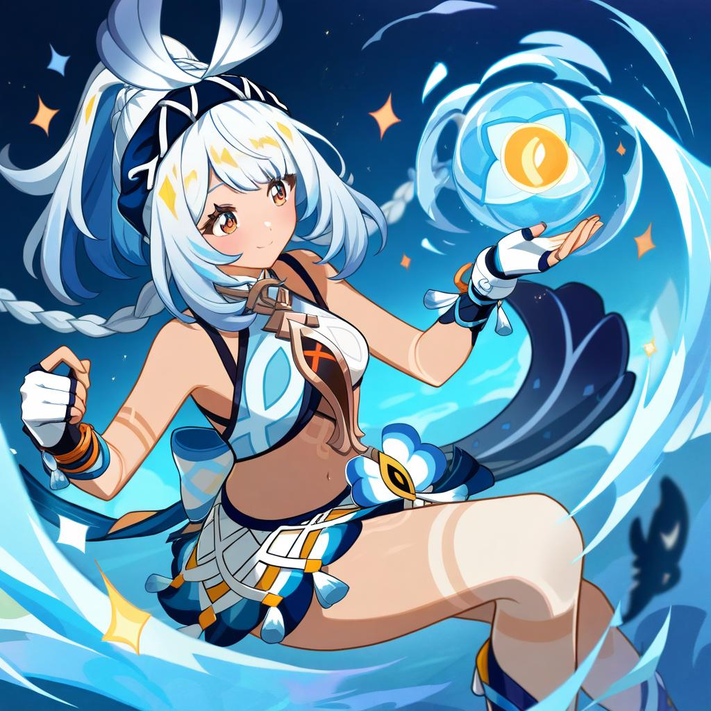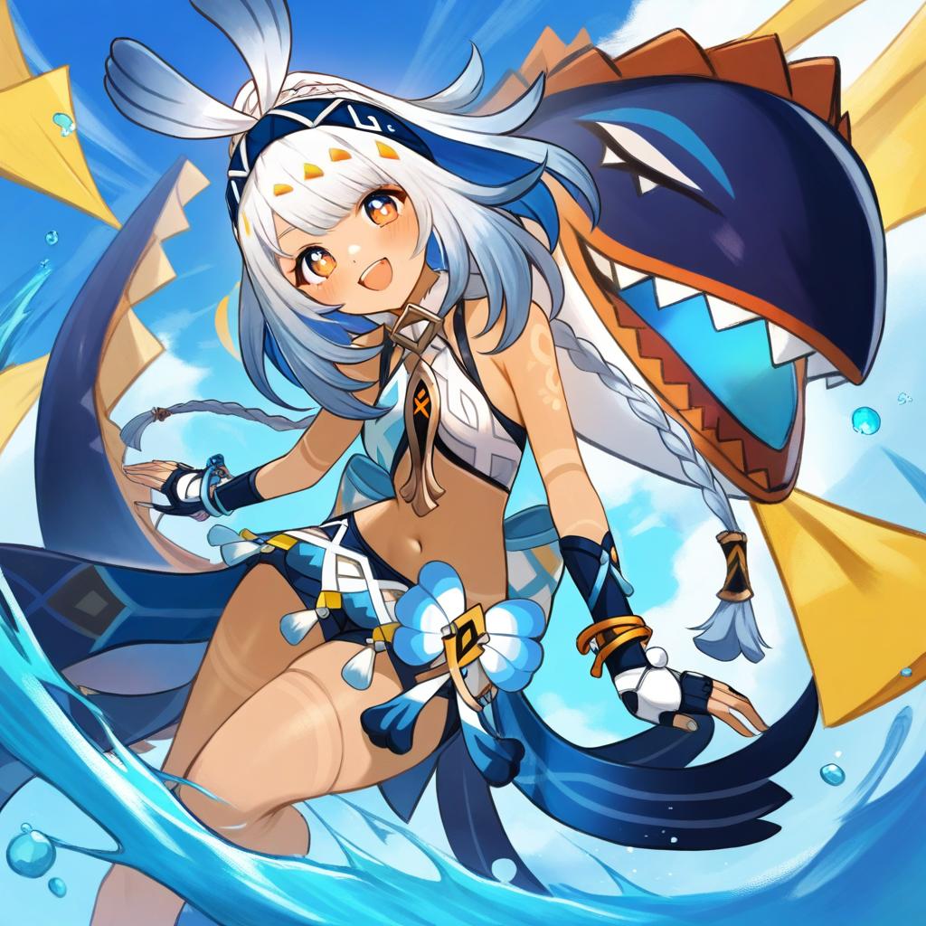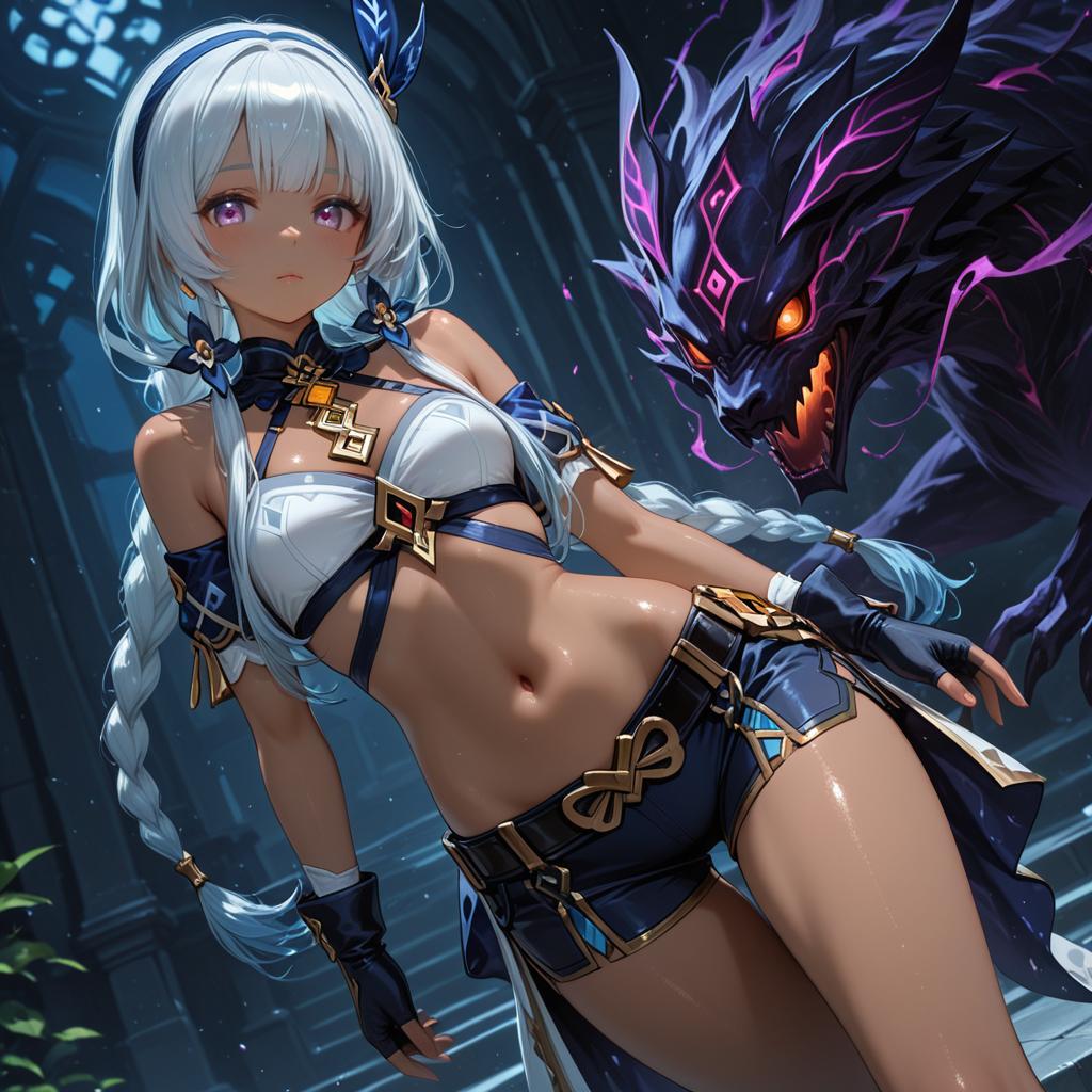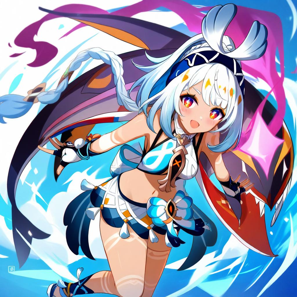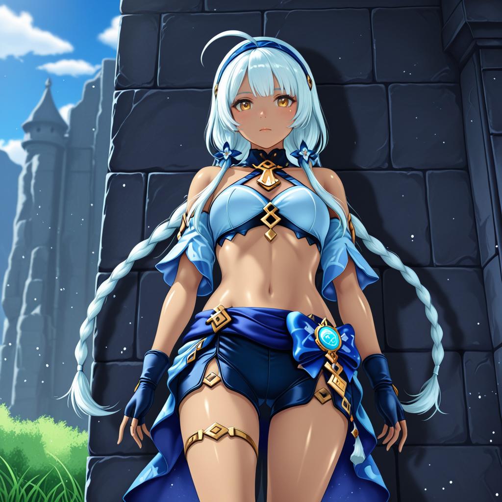 Mualani (genshin impact), genshin impact, 1girl, dark skin, red eyes, orange eyes, long hair, white hair, grey hair, light blue hair, blue hairband, low twin braids, braid, small breasts, thighs, navel, fingerless gloves, bare shoulders, midriff, stomach, by artist muffin (sirumeria), animagine