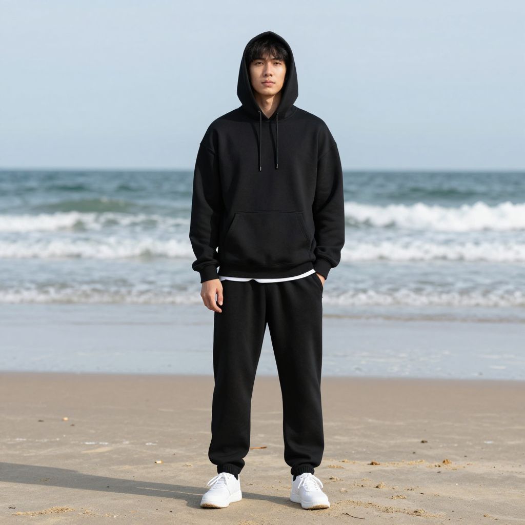 Young Asian man in black hoodie and pants, white sneakers, standing on sandy beach with ocean waves in background. Photorealistic image.