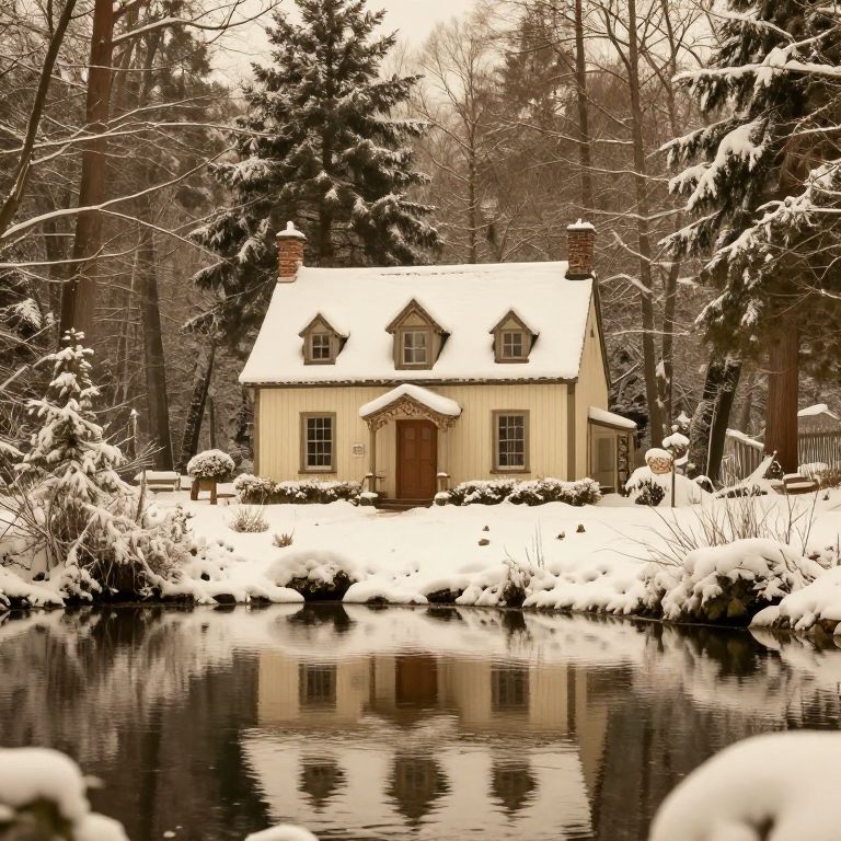 A picturesque, vintage-style cottage nestled in a snowy forest, reflecting in a serene pond under a warm, hyperrealistic light.