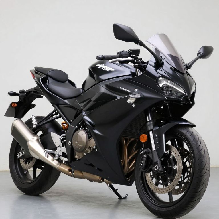 Black motorcycle showcasing sleek design and sporty aesthetics, featuring a prominent front fairing, dual headlights, and a polished exhaust system, positioned indoors against a clean backdrop.
