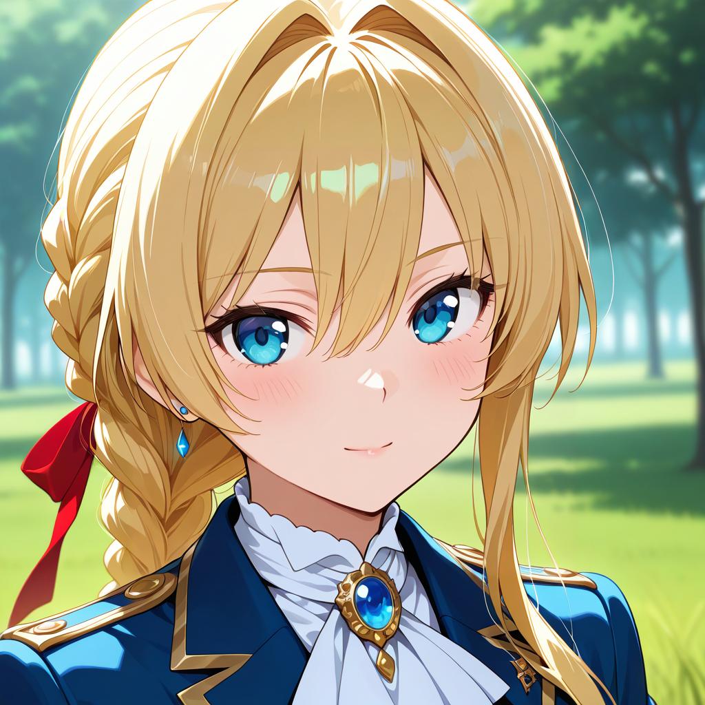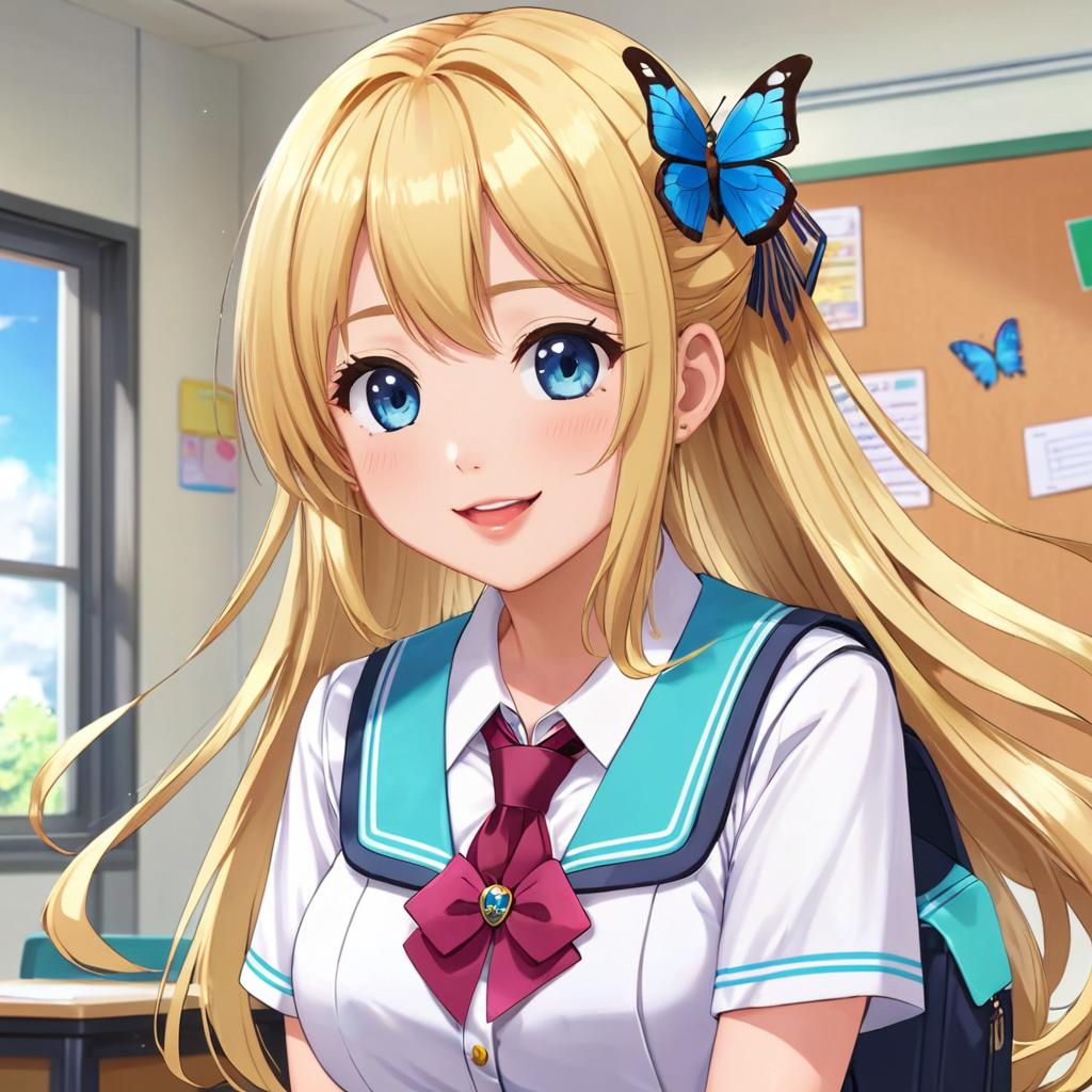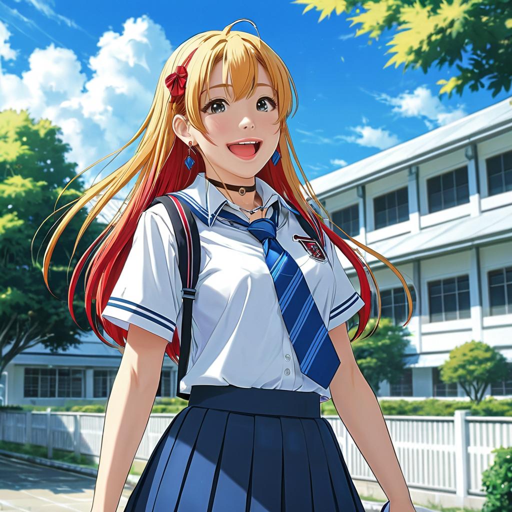 Anime-style digital illustration of a blonde girl with long hair, wearing a school uniform with a red tie, blue suspenders, and earrings, smiling outdoors