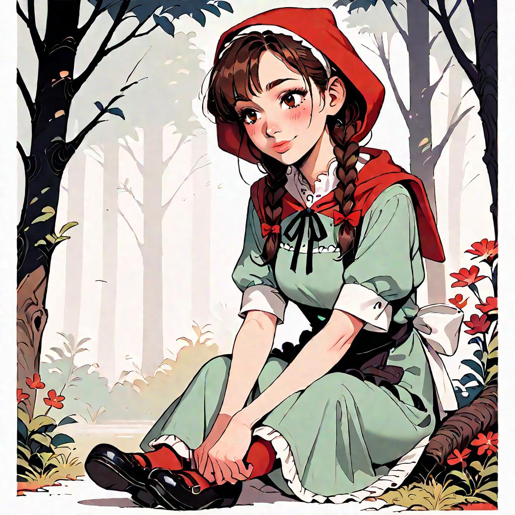Illustration of a young girl wearing a red hood, green short dress with a white apron, and black mary jane shoes with red socks, sitting in a forest. She has brown hair styled in twin braids with hair ribbons, a hairband, and a subtle blush on her cheeks. The background shows tall trees and scattered red flowers, creating a serene woodland atmosphere.