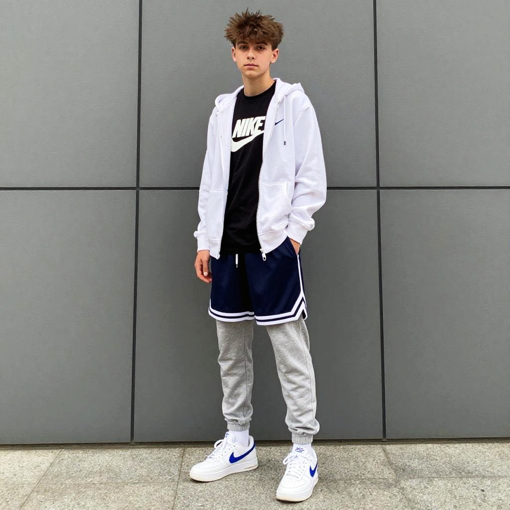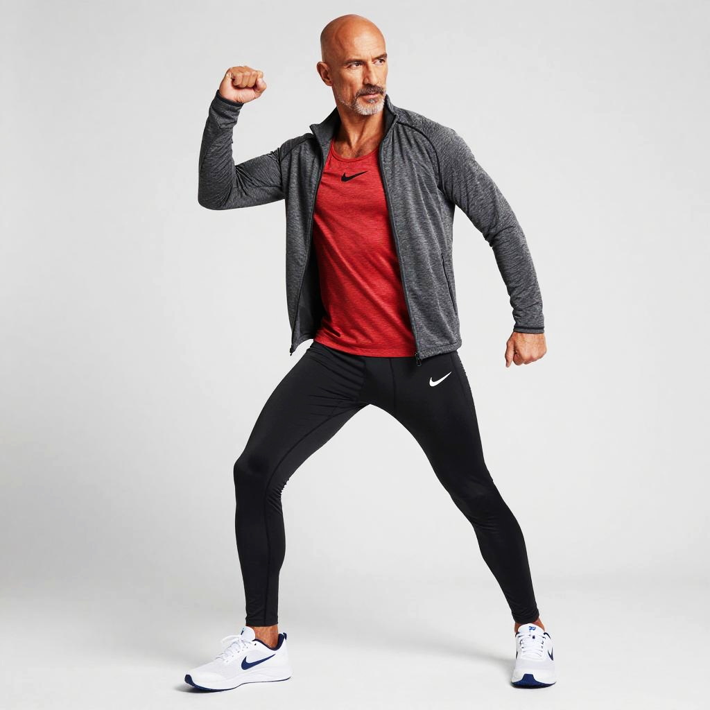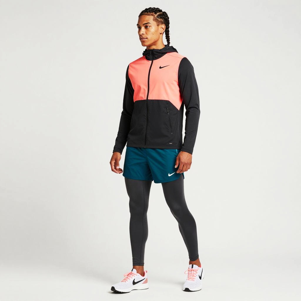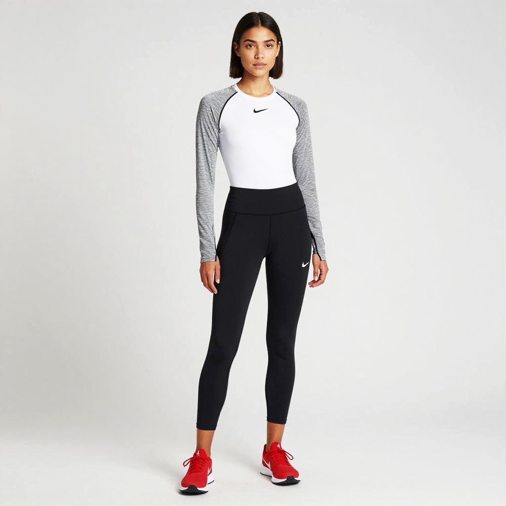 Young woman Slim Figure Shoulder length straight nike outfit black cropped leggings with bright red trainers and a white moisture-wicking long sleeve top, gray lightweight jacket with black jogger pants sleek athleisure