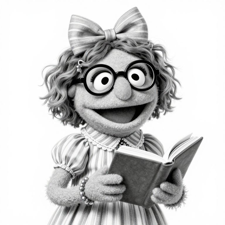 Monochrome digital drawing of a furry puppet with curly hair, large glasses, a bow, and striped dress, reading a book.