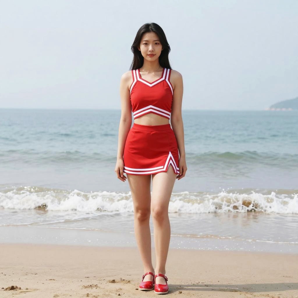 Red Cheer Costume, woman in red dress and red shoes standing on a beach