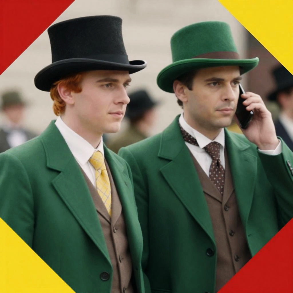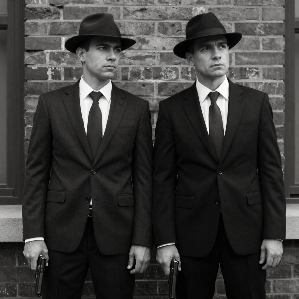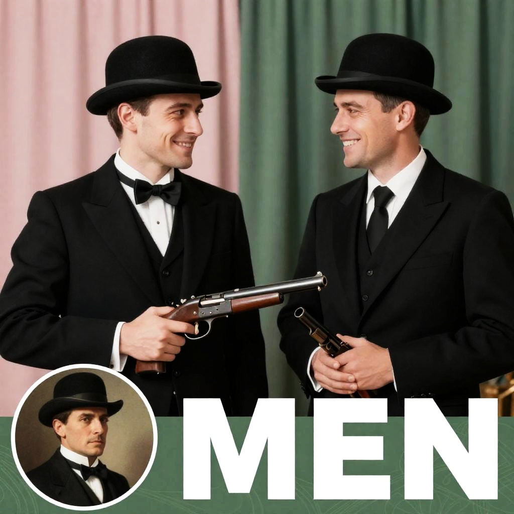 Photograph of two men in black suits and bowler hats, smiling at each other while holding a gun. The man on the left looks slightly to the right, the man on the right looks at the left. Background has pink and green curtains. Lower left corner has a circular portrait of a man in a hat and suit. Lower right corner has a green patterned background. "MEN" in bold white letters across the bottom.