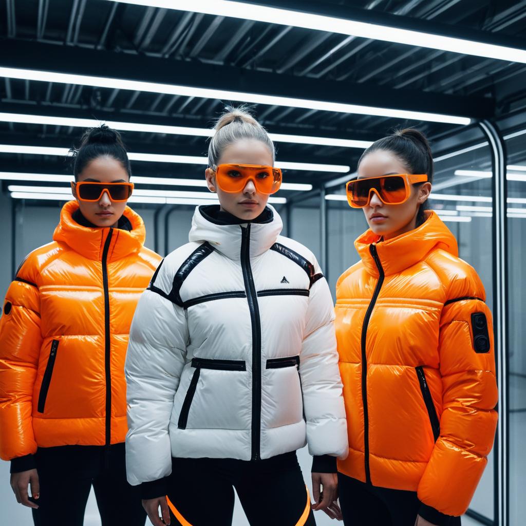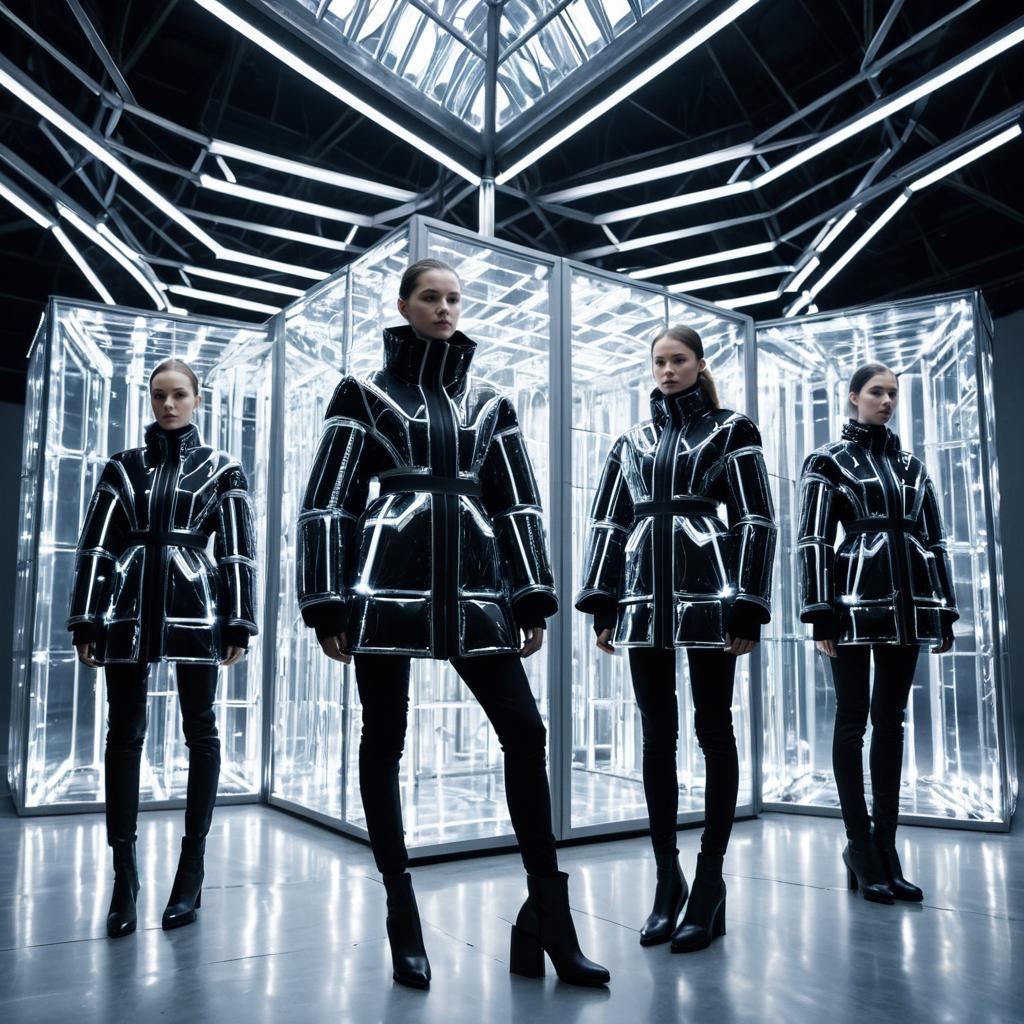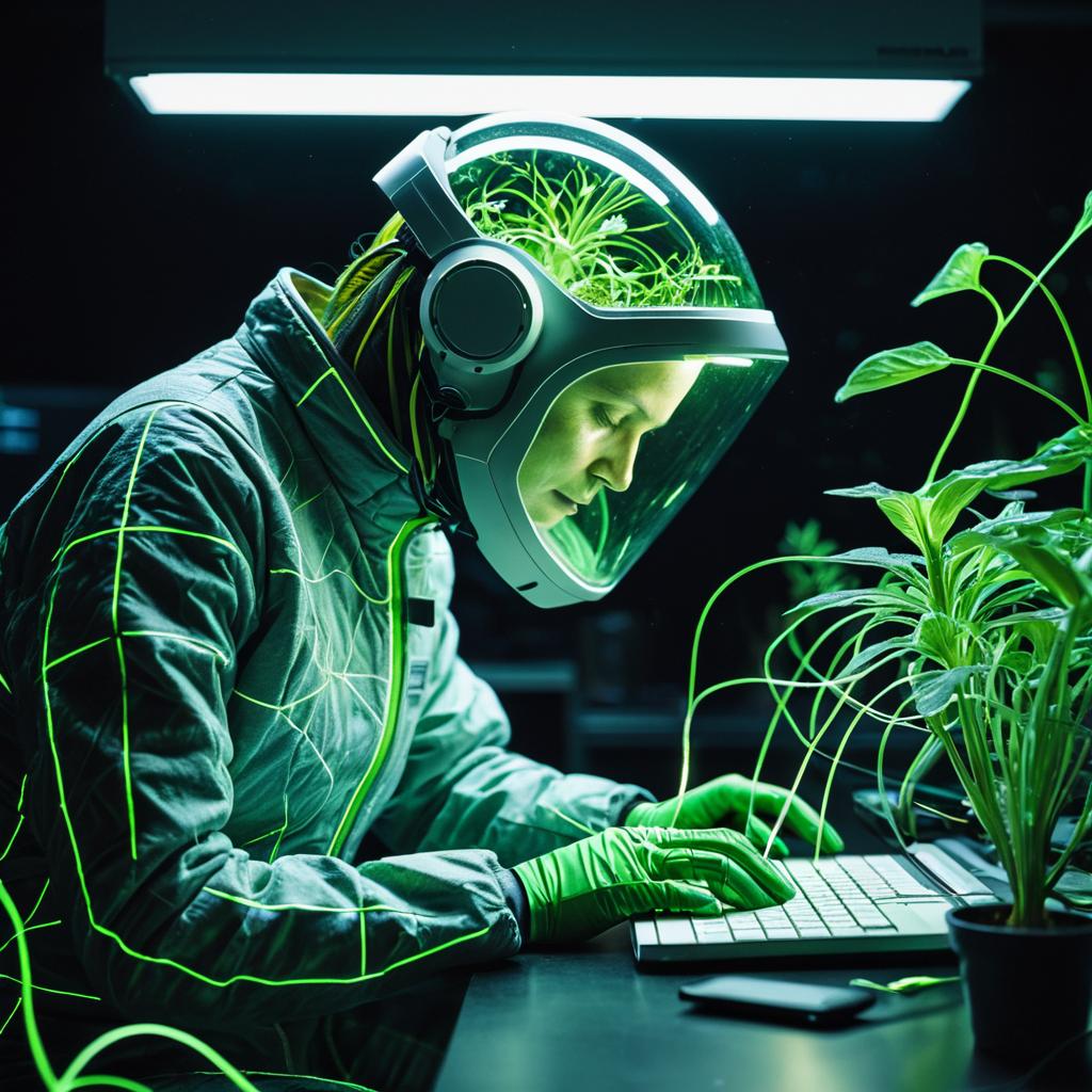 A highly detailed portrait of biologist studying luminous plants in a biotech suit, featuring glowing green fibers, biomechanical enhancements, transparent leaf-patterned fabric. Set in a puffy safety space, photorealistic lighting, 8K, in the style of Alex Grey, directed by Denis Villeneuve
