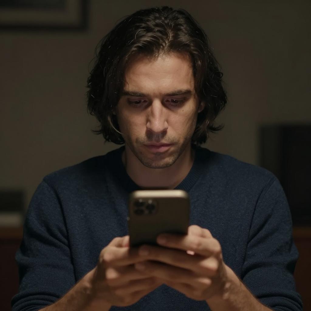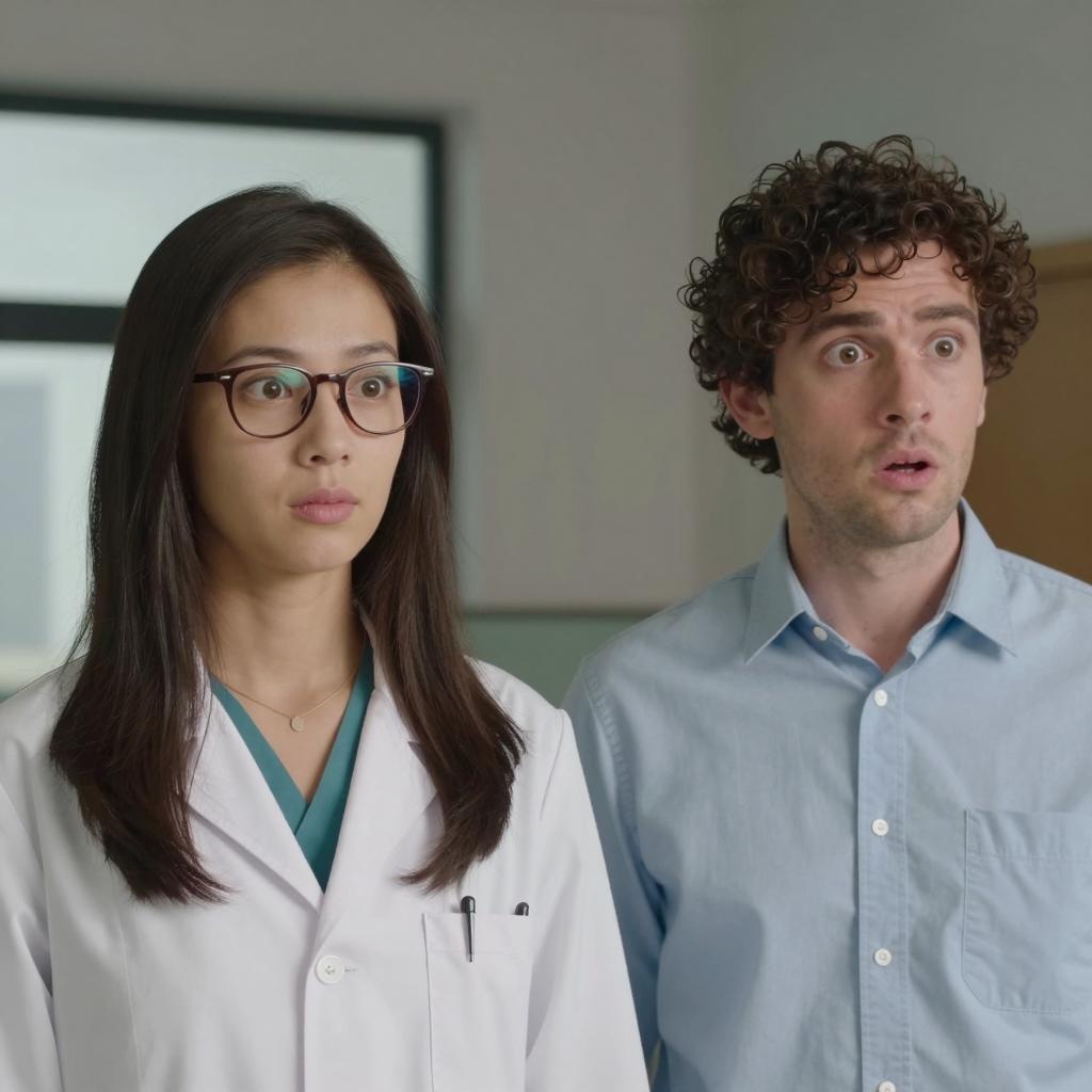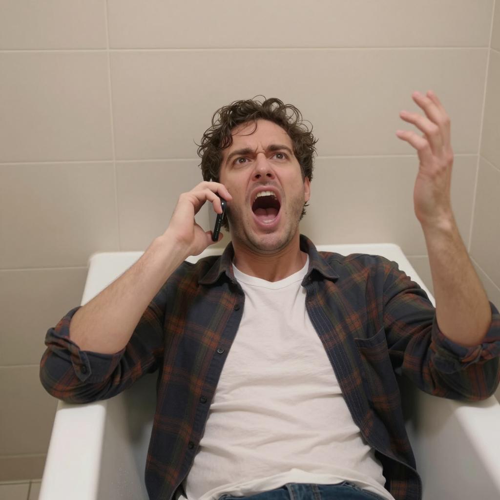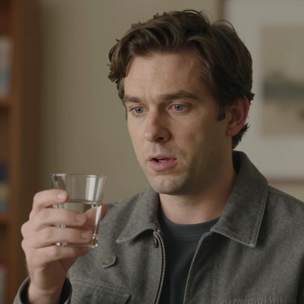 Man with curly brown hair and light stubble, wearing a wet, purple shirt, holds a blue cup. His mouth is open in surprise. Background includes blurred red and gray elements and a glass surface with water droplets. Intense expression.