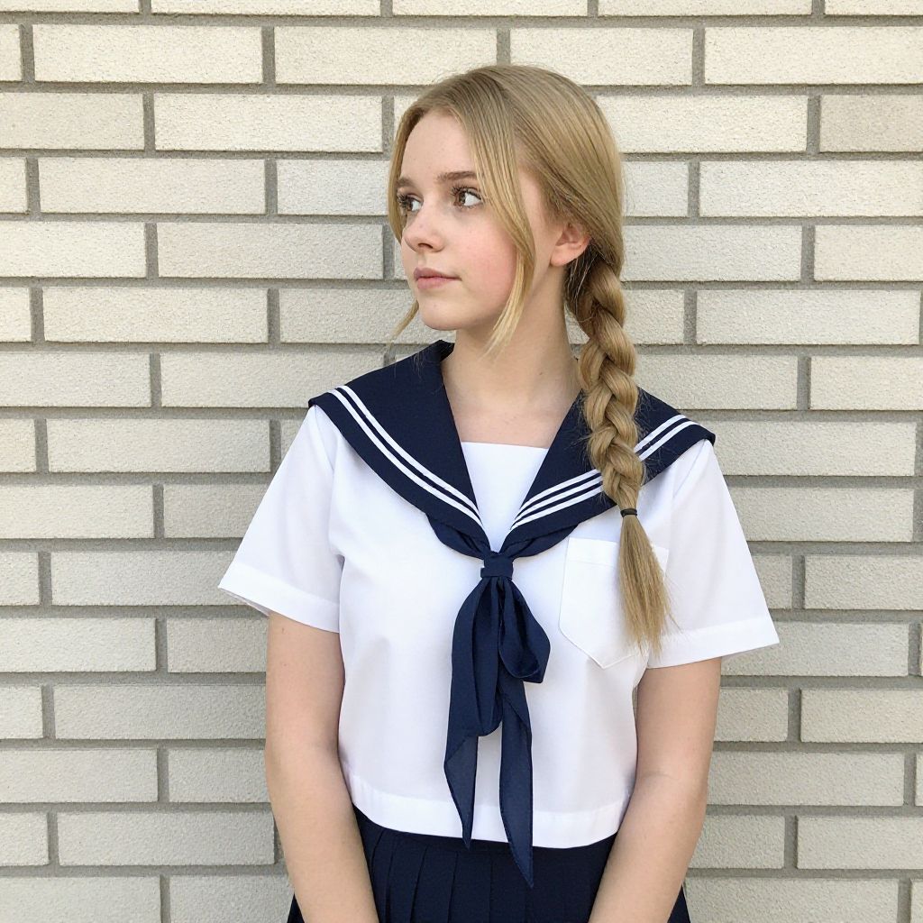 A young woman with blonde hair styled in a braid is dressed in a traditional Japanese schoolgirl uniform featuring a navy blue sailor collar and tie over a white blouse. She is standing against a light-colored brick wall, looking thoughtfully to the side in this bright, high-quality portrait.