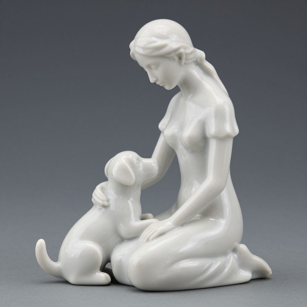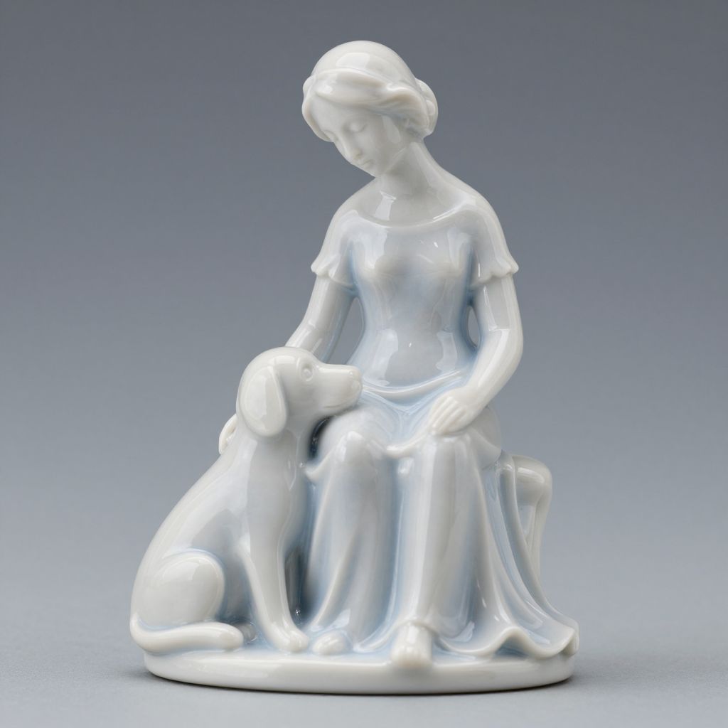 Photograph of a white ceramic figurine depicting a woman in a dress gently petting a sitting dog, set against a gradient gray background.