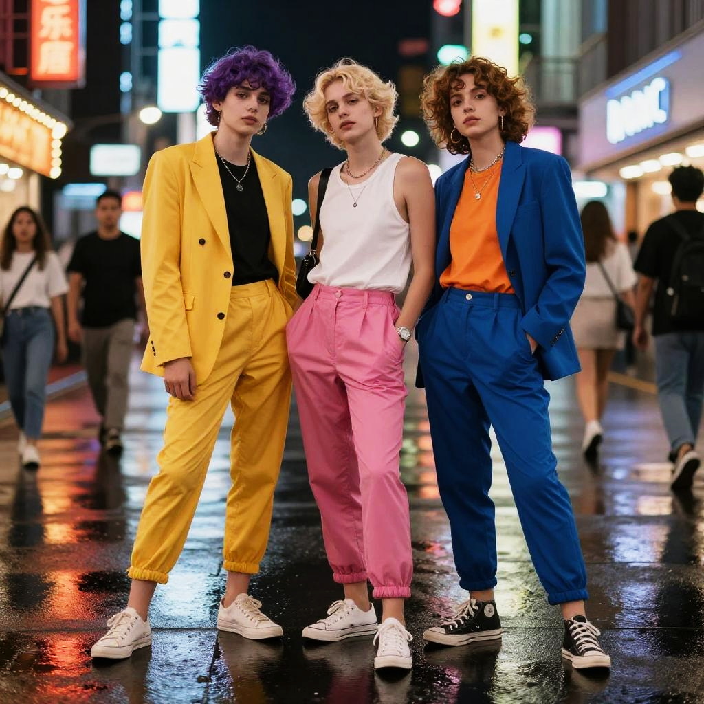 Photograph of three young adults standing on a wet, neon-lit city street at night. The person on the left has purple curly hair, a yellow blazer over a black shirt, and yellow pants, wearing white sneakers. The middle person has short blonde hair, a white tank top, and pink pants, also in white sneakers. The right person has curly brown hair, a blue blazer over an orange shirt, and blue pants, in black sneakers. The background features illuminated billboards and blurred pedestrians. The overall vibe is vibrant, modern, and stylish.