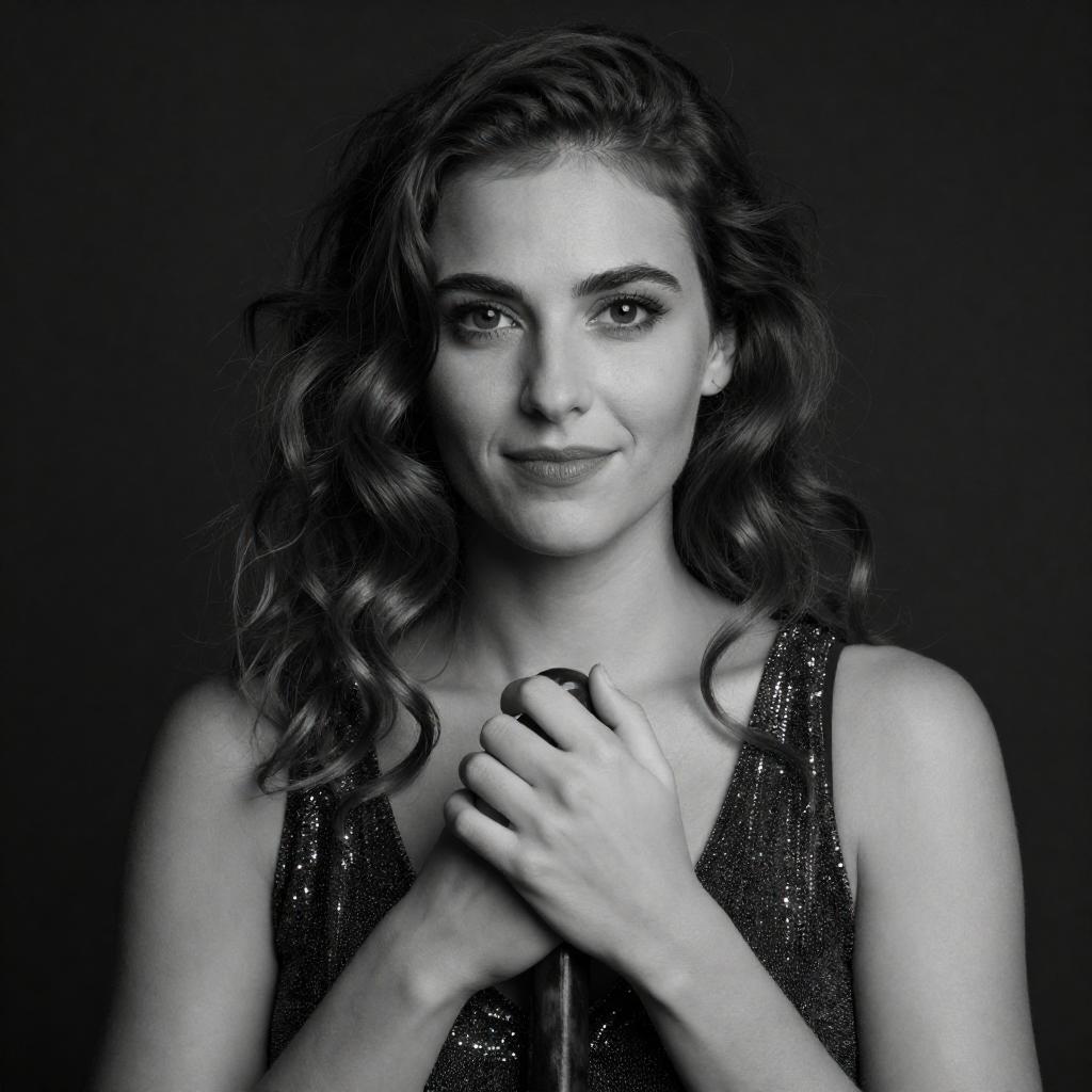 Black-and-white photograph of a woman with wavy, shoulder-length hair, wearing a sparkly, sleeveless top. She holds a dark, ured object close to her chest with both hands. Her expression is serious, with a slight smile. The background is dark, highlighting her illuminated face and hands.