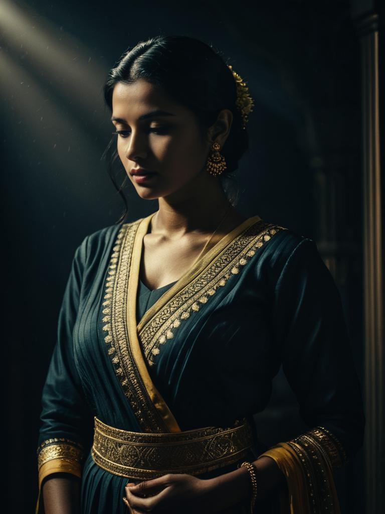 Woman in Dhoti Suit Salwar, waist-up editorial portrait, photorealistic tones --sref 1391