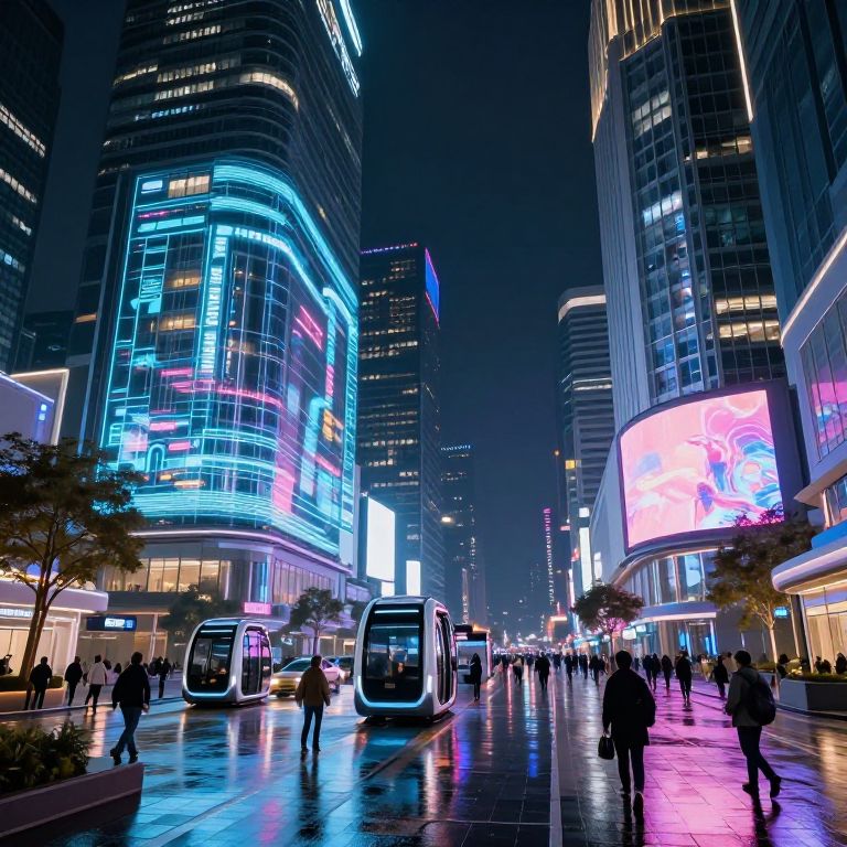 Realistic future city at night, illuminated by holographic billboards and vibrant neon signs, sleek high-rise buildings with transparent walls, bustling pedestrian zones with advanced public transport pods, reflections on rain-soaked streets, intricate details in futuristic urban planning