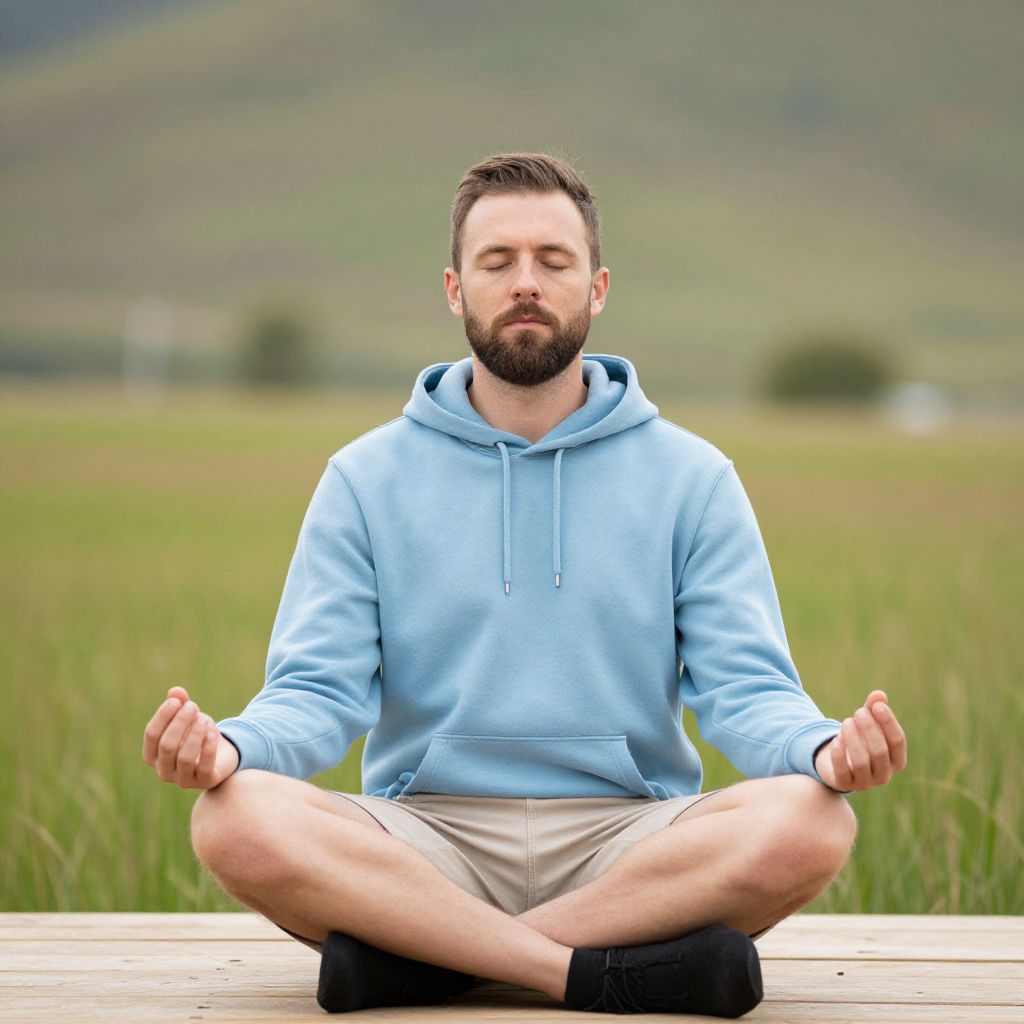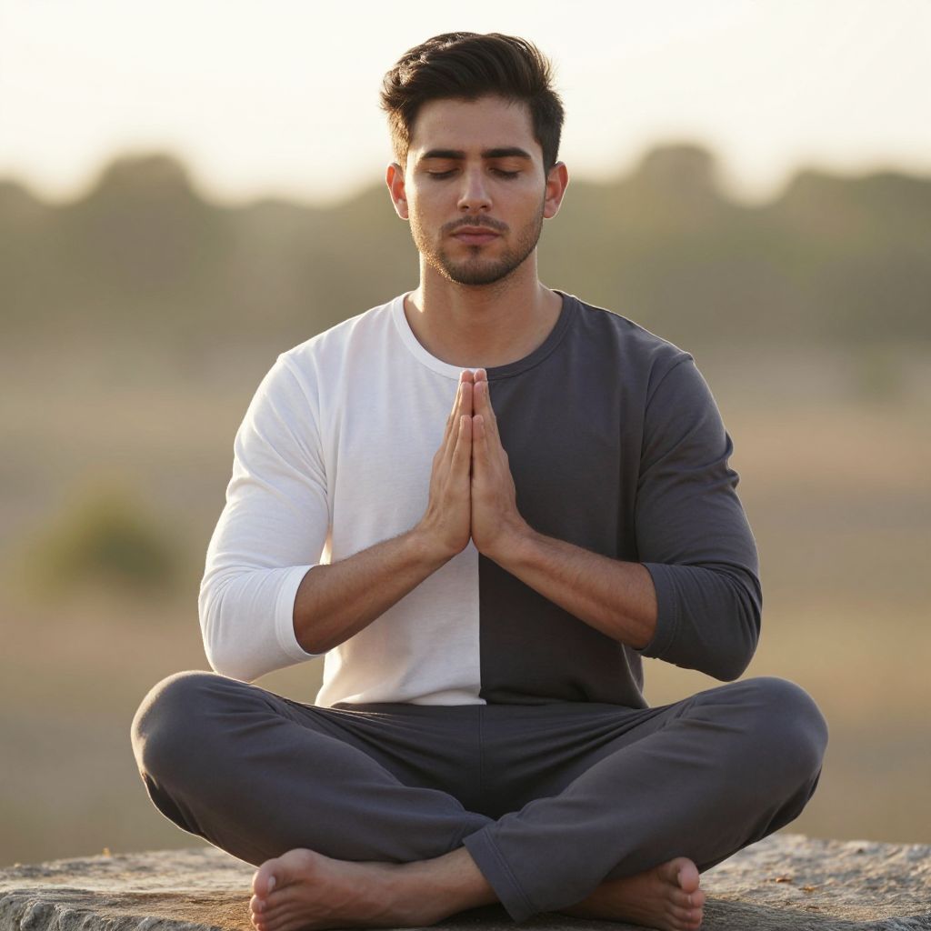 Photograph of a young, attractive man with light brown skin and short, dark hair, sitting cross-legged in a serene outdoor setting. He has a trimmed beard and is meditating with eyes closed, hands pressed together in a prayer position at his chest. He wears a long-sleeved, two-tone shirt (white on the left, dark gray on the right) and dark gray pants. The background is softly blurred with greenish and brownish hues, suggesting a natural, grassy area. The lighting is soft, enhancing the calm and focused atmosphere.