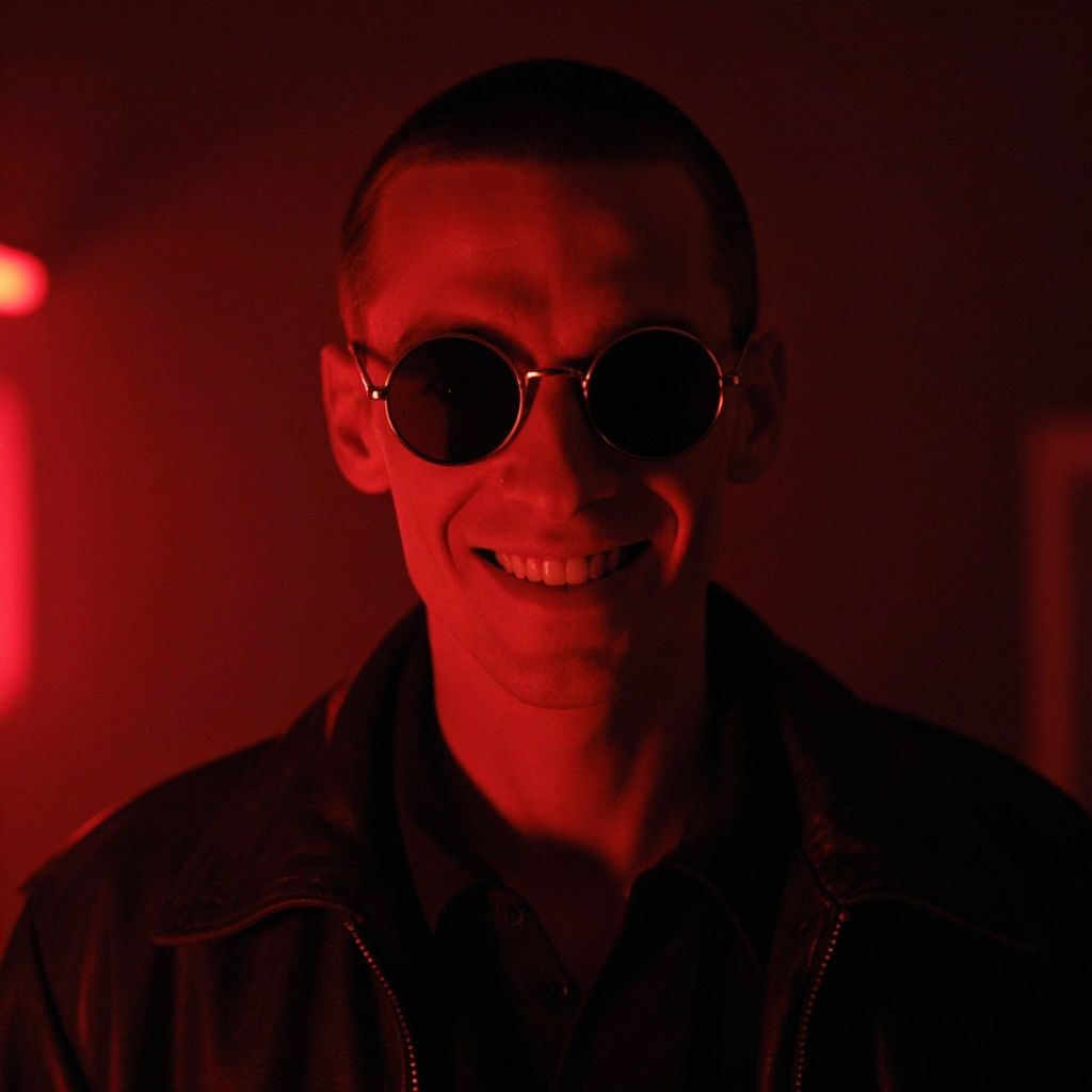 Portrait of a slender man with short hair and rounded sunglasses, malevolent smile, atmospheric and obscure, red neon light, by roger deakins, cinematography, syd mead, realistic, 80 mm