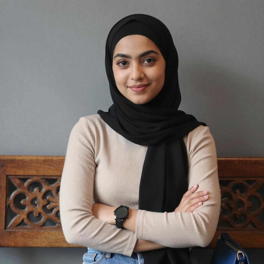 Photograph of a young woman with light brown skin and brown eyes, wearing a beige hijab and matching long-sleeve top over a black shirt. She sits on a gray velvet couch, holding a gold velvet pillow. Brown curtains frame a bright window in the background. She wears a gold watch on her left wrist.