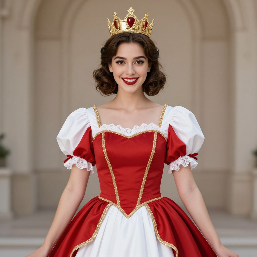 Photorealistic digital image of a young woman with fair skin, dark brown wavy hair, and red lipstick, wearing a golden crown with red jewels. She is dressed in a red and white Renaissance-style princess gown with gold trim, puffed white sleeves, and a white lace neckline. She stands in a grand, arched, stone building with blurred, neutral-colored background. Her confident smile and poised stance exude regality. The image has a soft, even lighting, emphasizing her elegant and cheerful demeanor.