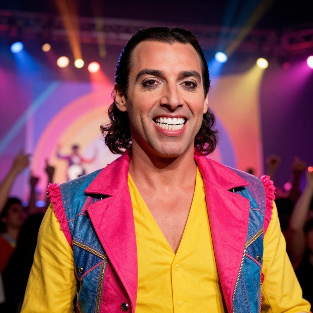 Photograph of a smiling man with medium-length black hair, wearing a vibrant yellow shirt, bright pink jacket with frayed edges, and blue denim vest. The background features colorful stage lights in pink, blue, and yellow, and a blurred crowd with raised hands. The man's teeth are prominently white, and he has a light skin tone. The image has a lively, colorful, and festive atmosphere, highlighting the subject's cheerful expression and bold fashion choices.