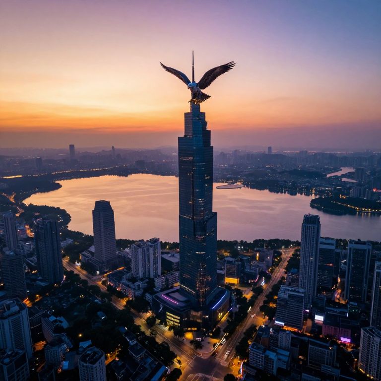 A serene landscape gradually transforms from an idyllic sunrise over a tranquil lake into a vibrant, futuristic cityscape under the watchful gaze of a colossal mechanical eagle perched atop a towering skyscraper. The scene is captured from a bird's-eye view that highlights the intricate network of roads and glowing neon lights in contrast with the calm waters of the lake below. As day turns into night, the color palette shifts from warm oranges and yellows to cool blues and purples, reflecting the passage of time and showcasing the juxtaposition between nature and technology. This unique blend of natural serenity and urban complexity evokes a sense of wonder and nostalgia for both past and future, inviting viewers on an engaging journey through the evolving landscape.