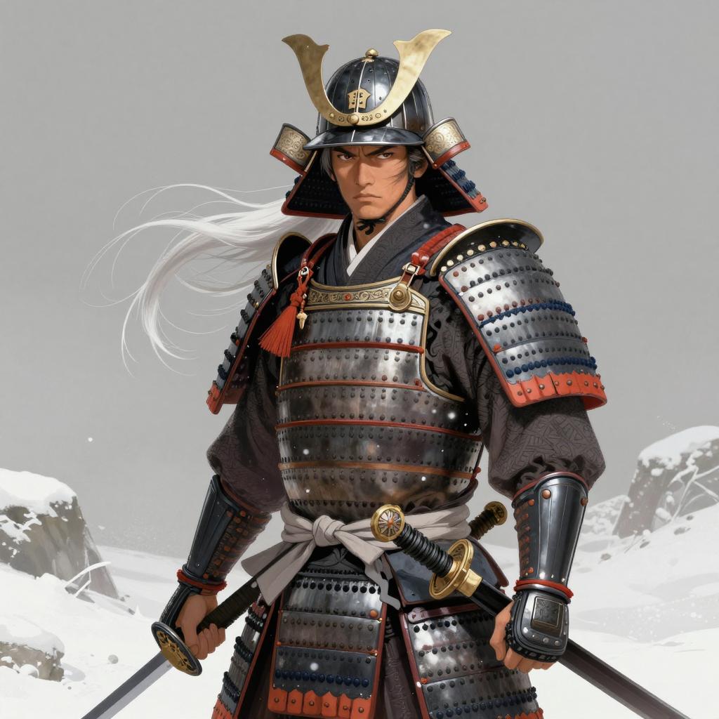 Digital illustration of a female samurai with long black hair, gold horned helmet, and detailed armor. She holds a sword in her right hand, with a sheathed sword at her waist. Dark, patterned kimono with red accents and white fabric. Black background. Intense expression. She stands slightly angled to the left.
