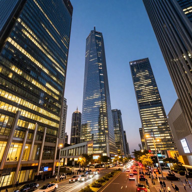Big_business towering skyscrapers at dusk, bustling urban cityscape with glowing office lights, sleek modern architecture, busy streets filled with people and cars, futuristic vibe, cinematic lighting, sharp details, vibrant colors