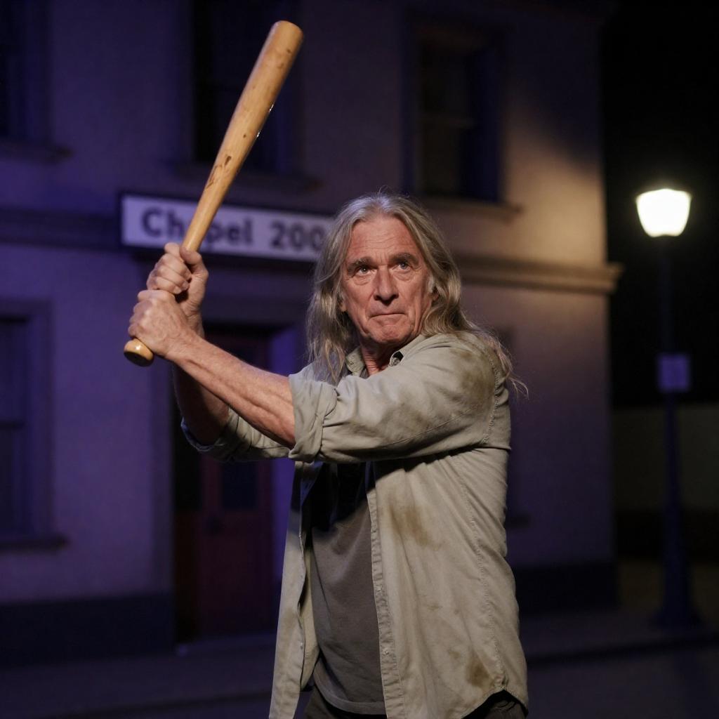 Photograph of an older man with long, disheveled hair, wearing a dirty, light-colored shirt, raising a wooden bat in a dramatic gesture. He stands in front of a dimly lit, purple-hued building with signs reading "Chapel" and "200". The scene is illuminated by streetlights, creating a tense, nighttime atmosphere.