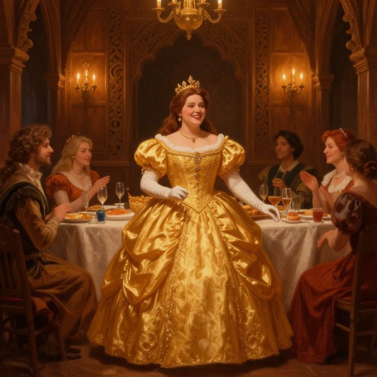 Plump princess enjoying a feast in a royal banquet hall, sumptuous golden dress, smiling companions, intricate wooden carvings on walls, warm lighting from chandeliers, cozy medieval atmosphere, painterly style, rich color palette