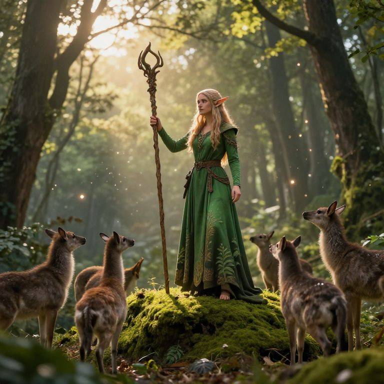 Seija in a whimsical fantasy village scene, interacting with woodland creatures, surrounded by blossoming flowers and rustic cottages, bathed in warm golden sunset light, dressed in simple yet elegant attire with floral embroidery and nature-inspired jewelry.