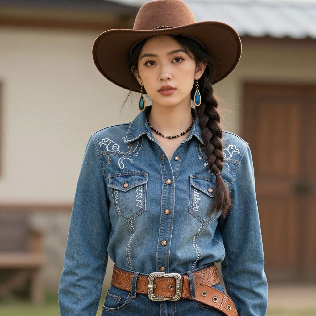 A young woman dressed in a stylish cowboy outfit featuring a brown wide-brimmed hat, denim shirt with embroidered pockets, and braided hair. She accessorizes with teardrop earrings, a beaded necklace, and a leather belt with detailed tooling, embodying a modern Western look in a rustic outdoor setting.