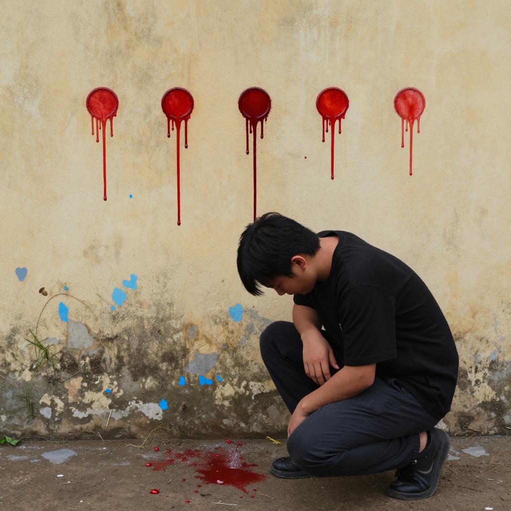 Man in black clothing, crouching, right side of image, head down, hands on knees. Wall in background with five red blood stains dripping. Dirt ground in front. Man's dark pants are wet near the knee. Weathered, yellowed wall with blue stains.