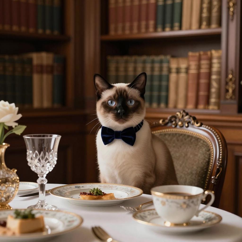 Elegant Siamese Cat at Fine Dining Table
